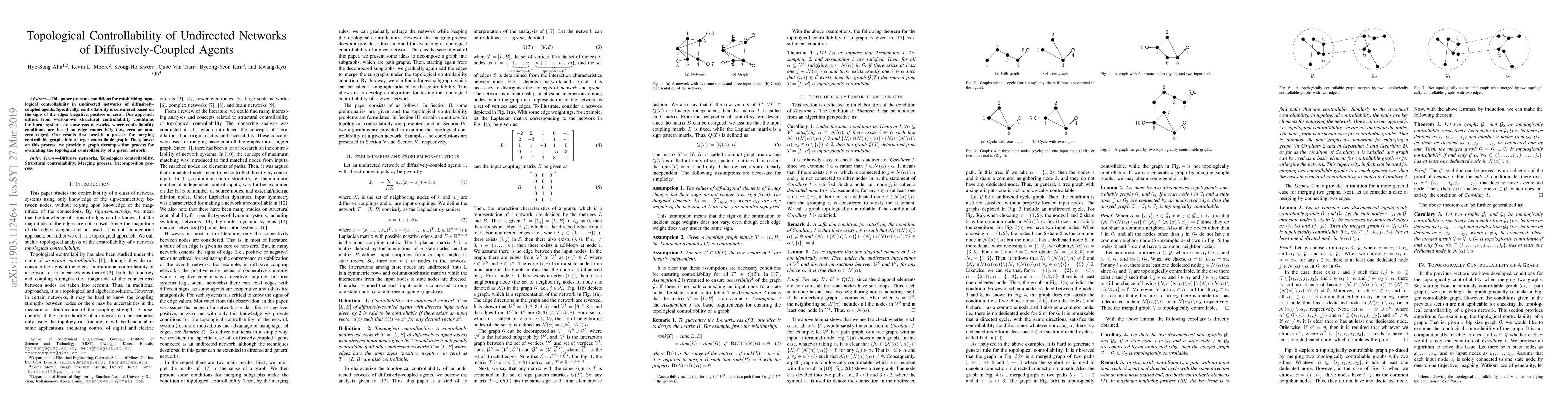 This paper establishes conditions for topological controllability in undirected networks of diffusively coupled agents based on edge signs, differing from structural controllability based on edge connectivity. It introduces a method for merging controllable graphs and a graph decomposition process to evaluate network controllability.