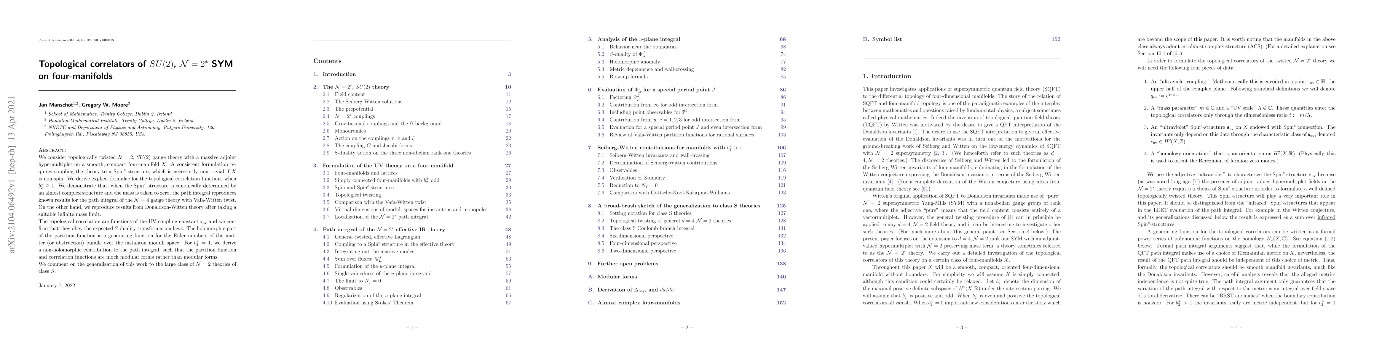 We consider topologically twisted $\mathcal{N}=2$, $SU(2)$ gauge theory with a massive adjoint hypermultiplet on a smooth, compact four-manifold $X$. A consistent formulation requires coupling the theory to a ${\rm Spin}^c$ structure, which is necessarily non-trivial if $X$ is non-spin. We derive explicit formulae for the topological correlation functions when $b_2^+\geq 1$. We demonstrate that, when the ${\rm Spin}^c$ structure is canonically determined by an almost complex structure and the mass is taken to zero, the path integral reproduces known results for the path integral of the $\mathcal{N}=4$ gauge theory with Vafa-Witten twist. On the other hand, we reproduce results from Donaldson-Witten theory after taking a suitable infinite mass limit. The topological correlators are functions of the UV coupling constant $\tau_{\rm uv}$ and we confirm that they obey the expected $S$-duality transformation laws. The holomorphic part of the partition function is a generating function for the Euler numbers of the matter (or obstruction) bundle over the instanton moduli space. For $b_2^+=1$, we derive a non-holomorphic contribution to the path integral, such that the partition function and correlation functions are mock modular forms rather than modular forms. We comment on the generalization of this work to the large class of $\mathcal{N}=2$ theories of class $S$.
