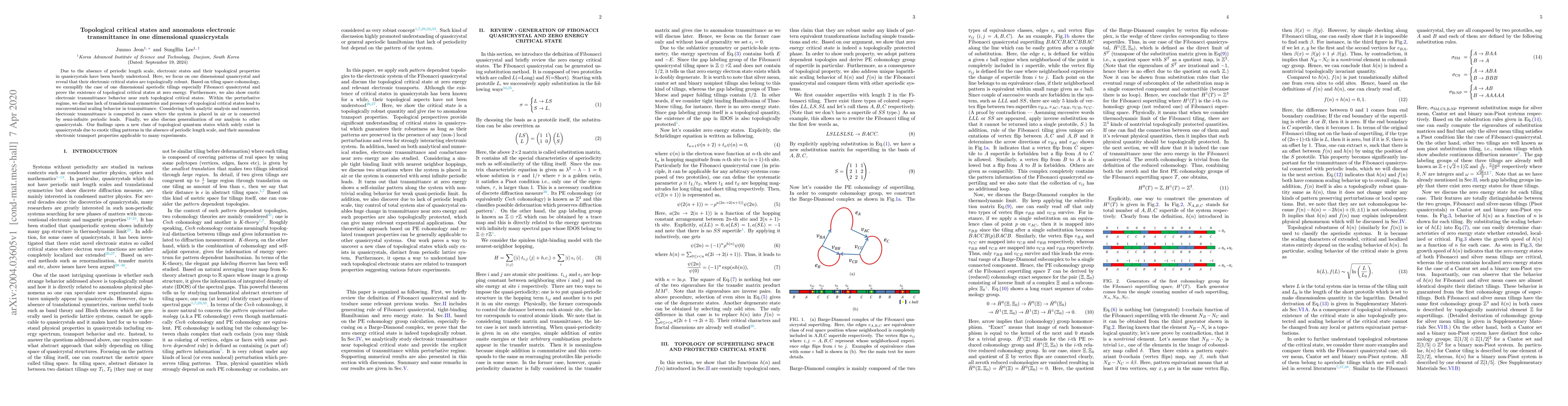 This paper explores topological critical states in one-dimensional quasicrystals, particularly Fibonacci quasicrystals, demonstrating their robustness and zero-energy existence. The study reveals anomalous electronic transmittance behaviors near these critical states, showing unconventional scaling due to the lack of translational symmetry.