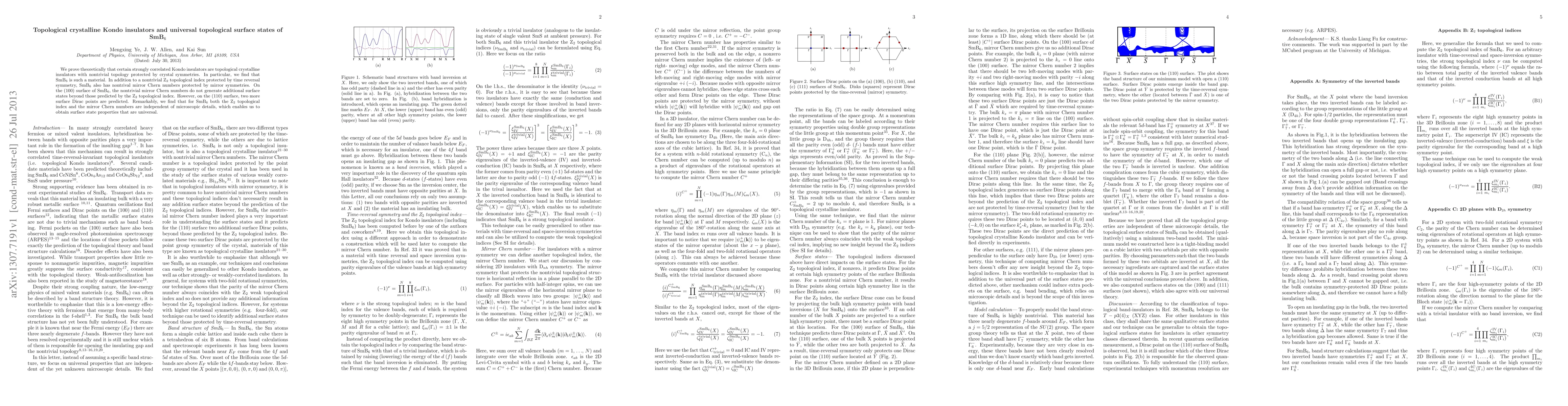 Theoretical proof that strongly correlated Kondo insulators, like SmB$_6$, are topological crystalline insulators with a nontrivial Z$_2$ topological index and additional mirror Chern numbers. SmB$_6$'s surface states are universal and independent of microscopic details, predicting extra surface Dirac points on the $(110)$ surface.