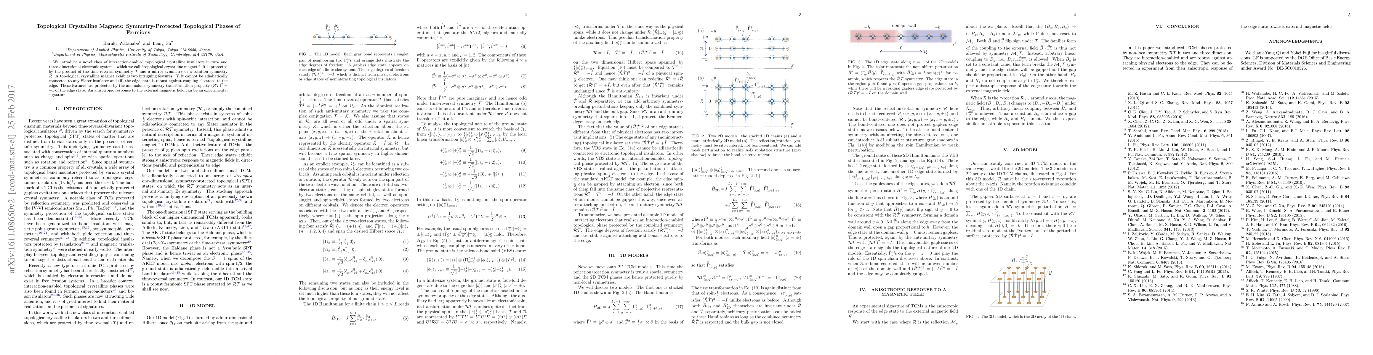 This paper introduces "topological crystalline magnets," a new class of insulators protected by combined time-reversal and mirror/rotation symmetries, featuring non-trivial edge states robust against electron coupling and an anisotropic magnetic response. Experimentally, these could be identified by their unique magnetic properties.
