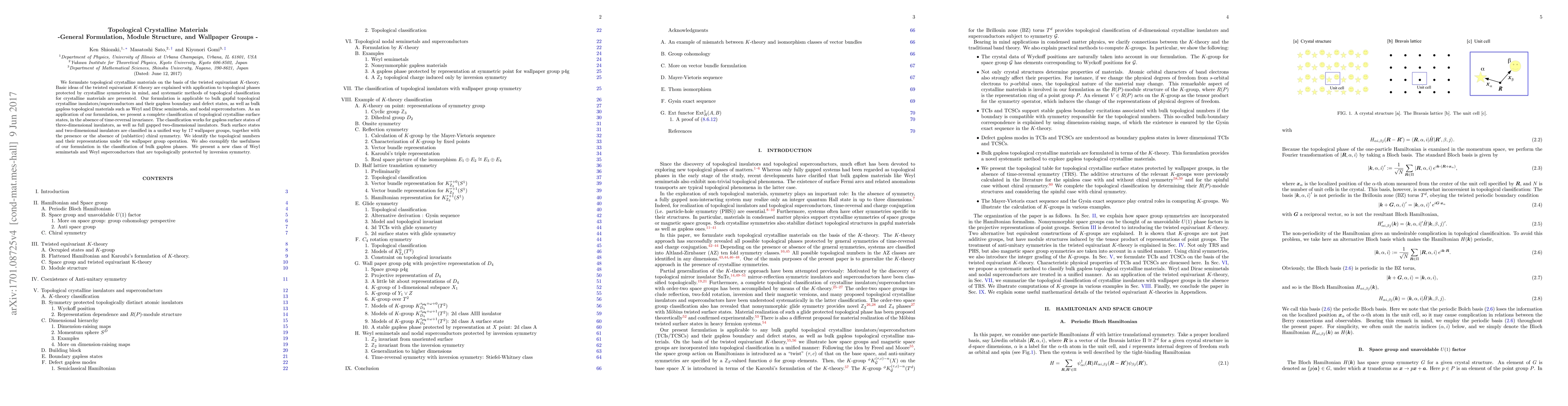 This paper formulates topological crystalline materials using twisted equivariant $K$-theory, presenting a systematic classification method applicable to various topological phases, including insulators, superconductors, and semimetals. It classifies topological surface states and two-dimensional insulators using 17 wallpaper groups, identifying topological numbers and their representations.