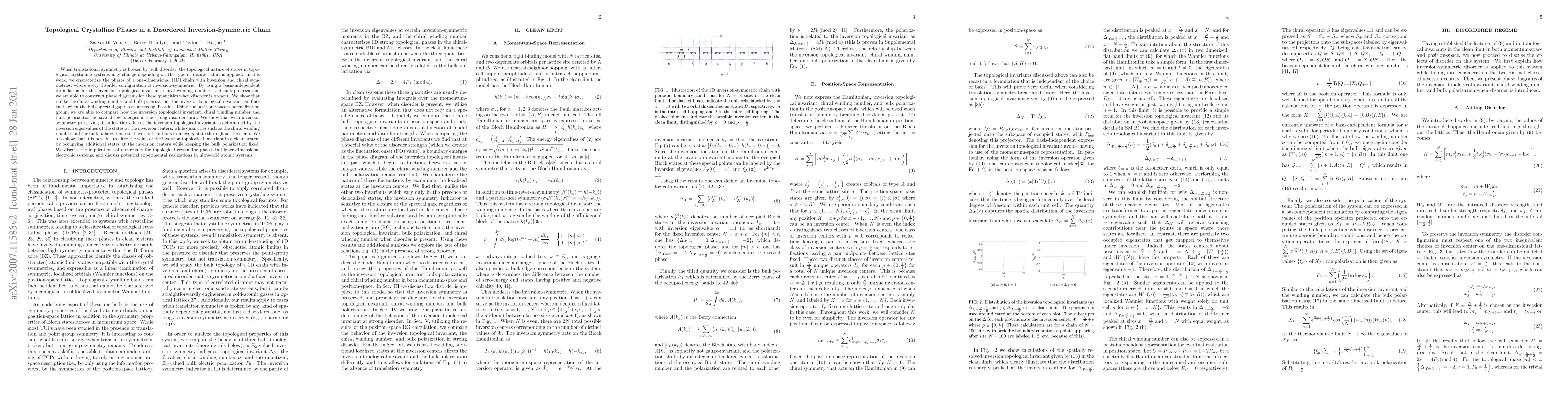 This study investigates topological crystalline phases in a one-dimensional disordered chain with inversion symmetry. It finds that while the inversion topological invariant can fluctuate under strong disorder, the chiral winding number and bulk polarization remain stable. The implications for higher-dimensional systems and ultra-cold atomic systems are also discussed.