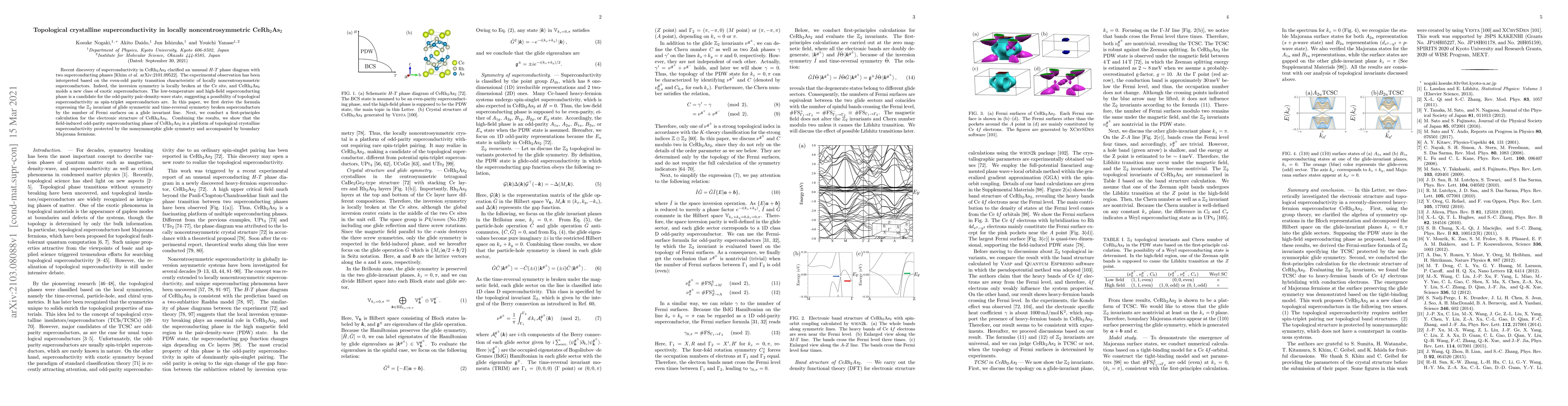 This paper discovers topological crystalline superconductivity in CeRh$_2$As$_2$, a locally noncentrosymmetric superconductor, by demonstrating its odd-parity pair-density-wave state and deriving a $\mathbb{Z}_2$ invariant. The study shows that this superconductor exhibits topological properties with Majorana fermions at its boundaries.