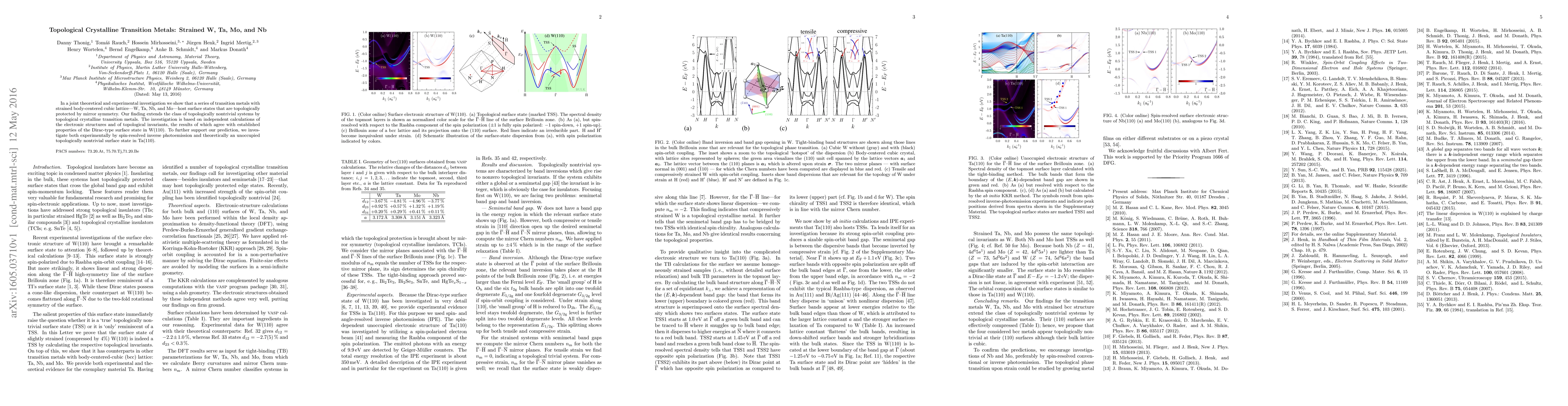 In a joint theoretical and experimental investigation we show that a series of transition metals with strained body-centered cubic lattice ---W, Ta, Nb, and Mo--- host surface states that are topologically protected by mirror symmetry. Our finding extends the class of topologically nontrivial systems by topological crystalline transition metals. The investigation is based on independent calculations of the electronic structures and of topological invariants, the results of which agree with established properties of the Dirac-type surface state in W(110). To further support our prediction, we investigate both experimentally by spin-resolved inverse photoemission and theoretically an unoccupied topologically nontrivial surface state in Ta(110).