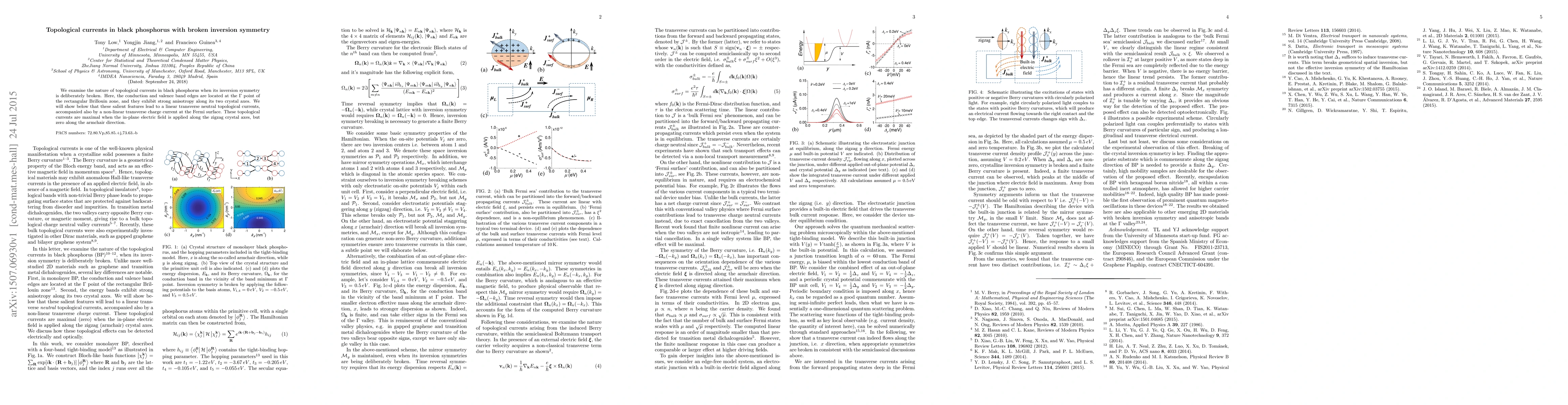 We examine the nature of topological currents in black phosphorus when its inversion symmetry is deliberately broken. Here, the conduction and valence band edges are located at the $\Gamma$ point of the rectangular Brillouin zone, and they exhibit strong anisotropy along its two crystal axes. We will show below that these salient features lead to a linear transverse neutral topological currents, accompanied also by a non-linear transverse charge current at the Fermi surface. These topological currents are maximal when the in-plane electric field is applied along the zigzag crystal axes, but zero along the armchair direction.