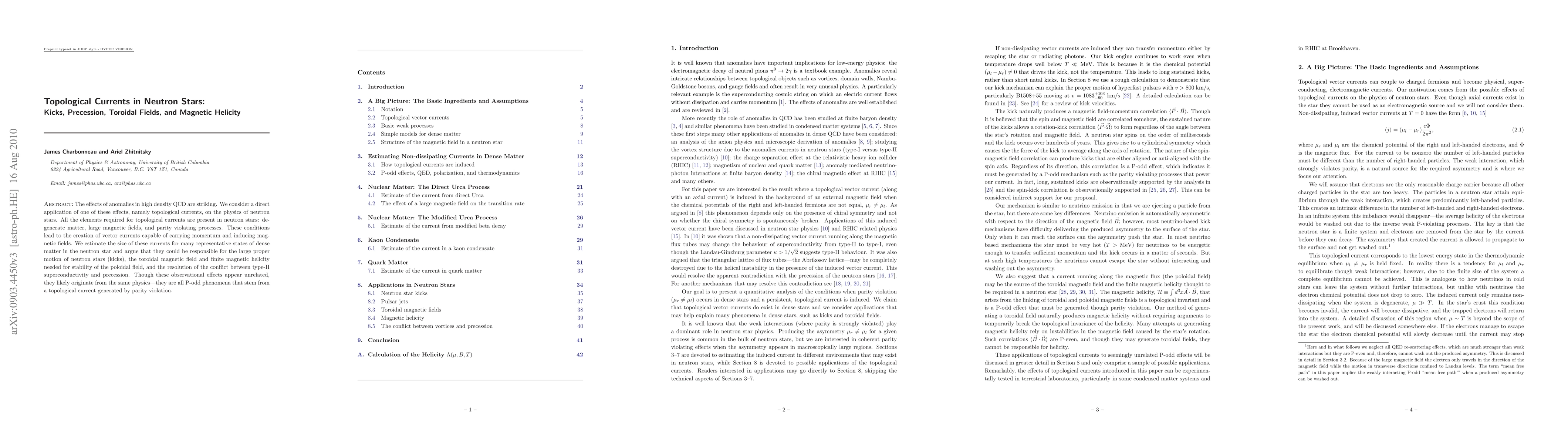 The effects of anomalies in high density QCD are striking. We consider a direct application of one of these effects, namely topological currents, on the physics of neutron stars. All the elements required for topological currents are present in neutron stars: degenerate matter, large magnetic fields, and P-parity violating processes. These conditions lead to the creation of vector currents capable of carrying momentum and inducing magnetic fields. We estimate the size of these currents for many representative states of dense matter in the neutron star and argue that they could be responsible for the large proper motion of neutron stars (kicks), the toroidal magnetic field and finite magnetic helicity needed for stability of the poloidal field, and the resolution of the conflict between type-II superconductivity and precession. Though these observational effects appear unrelated, they likely originate from the same physics -- they are all P-odd phenomena that stem from a topological current generated by parity violation.