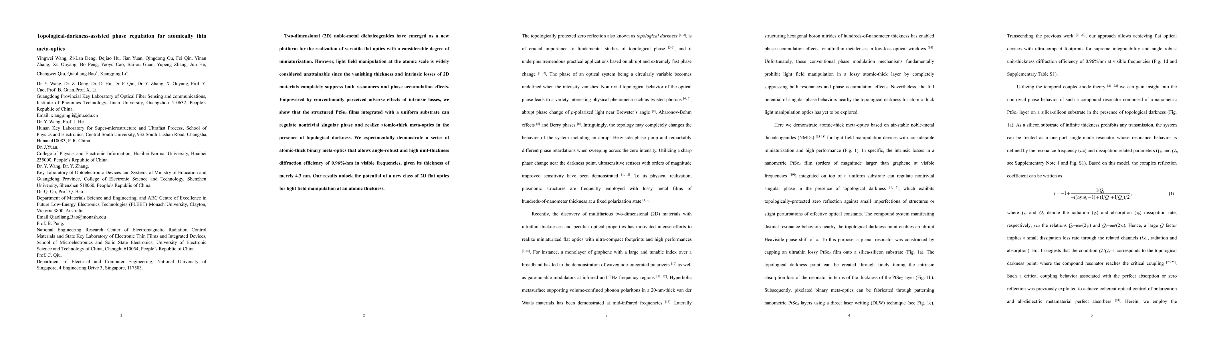 This paper demonstrates that topological darkness can enable atomic-scale phase regulation in 2D noble-metal dichalcogenides, achieving high diffraction efficiency in ultra-thin meta-optics despite intrinsic material losses. The structured PtSe2 films achieve an angle-robust diffraction efficiency of 0.96%/nm at visible frequencies, showcasing a new class of 2D flat optics.