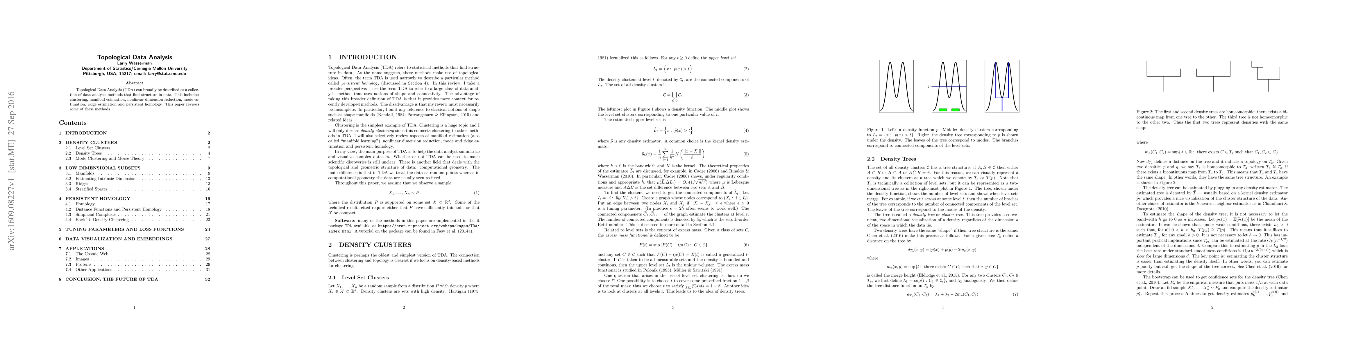 Summary: Topological Data Analysis (TDA) encompasses various data analysis techniques to uncover structural patterns, including clustering, manifold estimation, and persistent homology. This paper reviews these methods and their applications in data analysis.