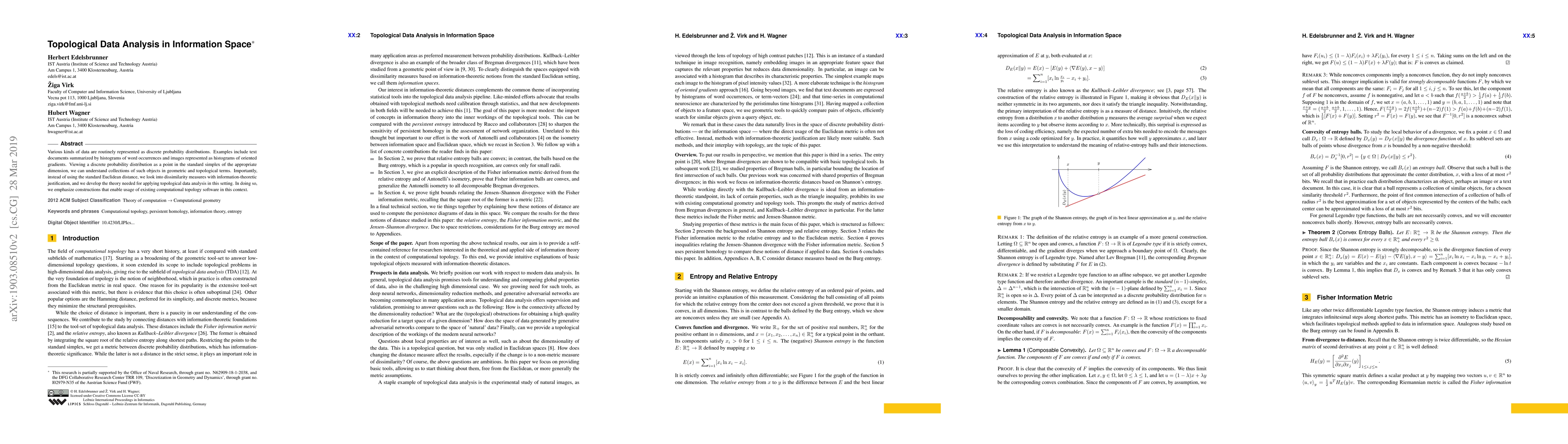 Various kinds of data are routinely represented as discrete probability distributions. Examples include text documents summarized by histograms of word occurrences and images represented as histograms of oriented gradients. Viewing a discrete probability distribution as a point in the standard simplex of the appropriate dimension, we can understand collections of such objects in geometric and topological terms. Importantly, instead of using the standard Euclidean distance, we look into dissimilarity measures with information-theoretic justification, and we develop the theory needed for applying topological data analysis in this setting. In doing so, we emphasize constructions that enable usage of existing computational topology software in this context.