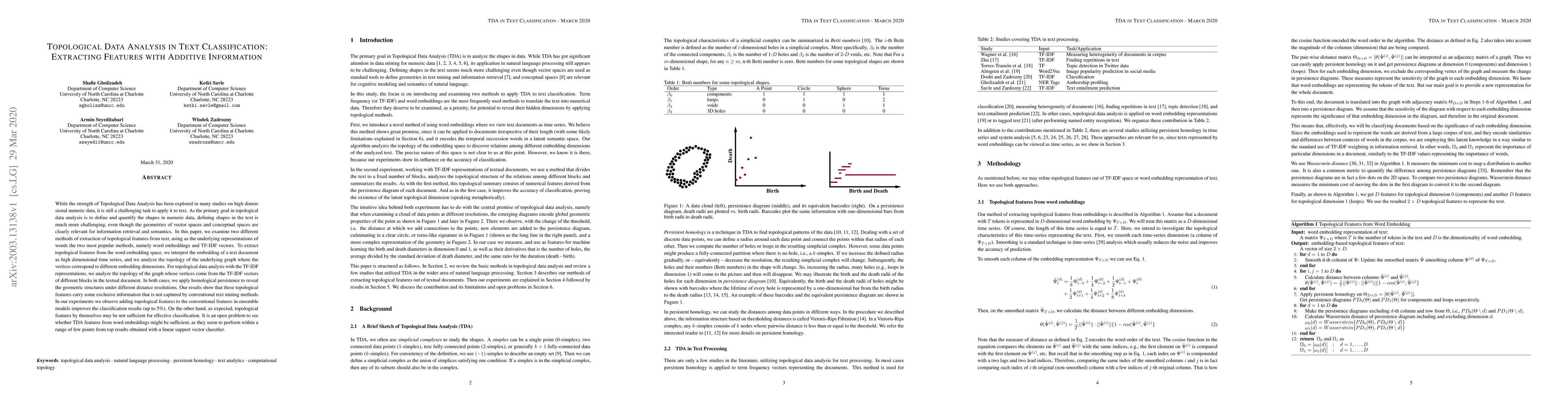 This paper explores the application of Topological Data Analysis (TDA) to text classification by extracting topological features from word embeddings and TF-IDF vectors. The study reveals that these features provide unique information, enhancing classification results when combined with conventional features, though they alone may not suffice.
