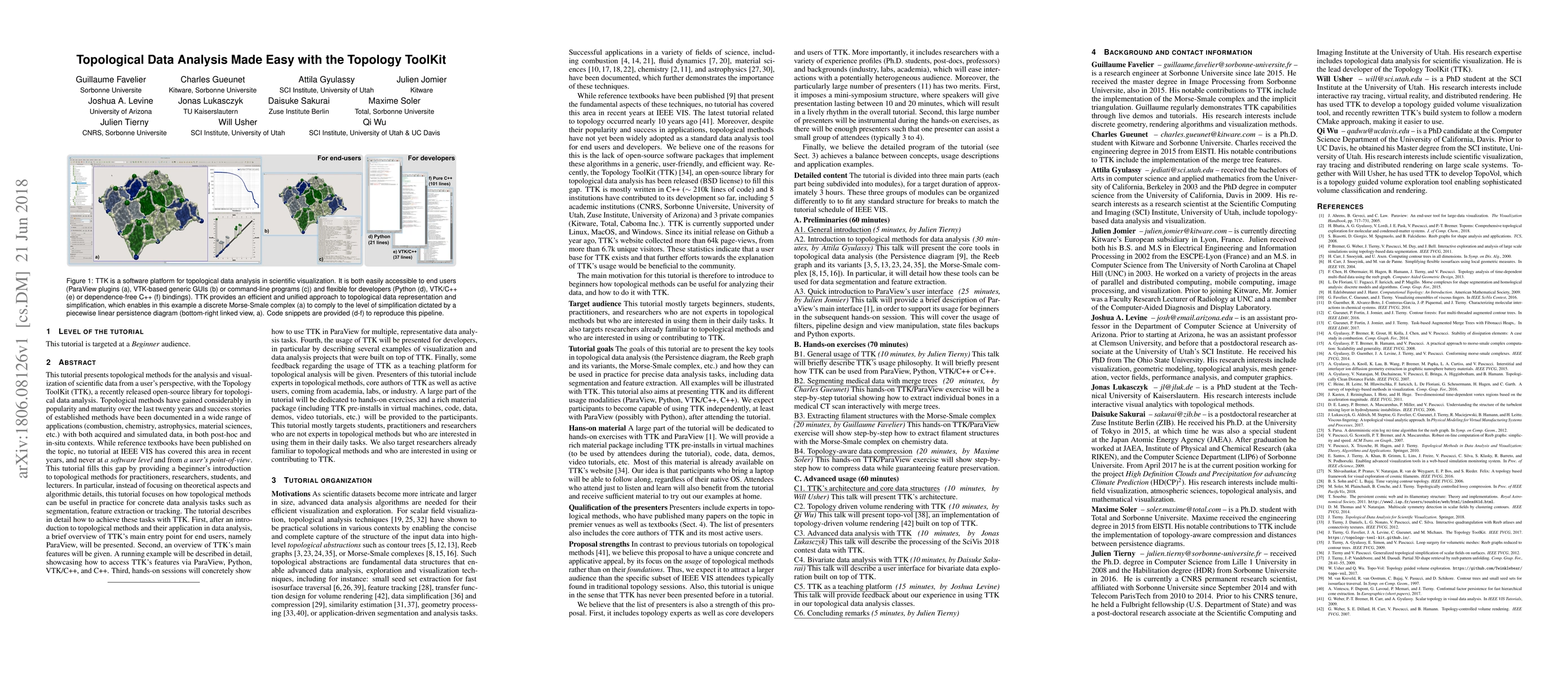 This tutorial presents topological methods for the analysis and visualization of scientific data from a user's perspective, with the Topology ToolKit (TTK), a recently released open-source library for topological data analysis. Topological methods have gained considerably in popularity and maturity over the last twenty years and success stories of established methods have been documented in a wide range of applications (combustion, chemistry, astrophysics, material sciences, etc.) with both acquired and simulated data, in both post-hoc and in-situ contexts. While reference textbooks have been published on the topic, no tutorial at IEEE VIS has covered this area in recent years, and never at a software level and from a user's point-of-view. This tutorial fills this gap by providing a beginner's introduction to topological methods for practitioners, researchers, students, and lecturers. In particular, instead of focusing on theoretical aspects and algorithmic details, this tutorial focuses on how topological methods can be useful in practice for concrete data analysis tasks such as segmentation, feature extraction or tracking. The tutorial describes in detail how to achieve these tasks with TTK. First, after an introduction to topological methods and their application in data analysis, a brief overview of TTK's main entry point for end users, namely ParaView, will be presented. Second, an overview of TTK's main features will be given. A running example will be described in detail, showcasing how to access TTK's features via ParaView, Python, VTK/C++, and C++. Third, hands-on sessions will concretely show how to use TTK in ParaView for multiple, representative data analysis tasks. Fourth, the usage of TTK will be presented for developers, in particular by describing several examples of visualization and data analysis projects that were built on top of TTK. Finally, some feedback regarding the usage of TTK as a teaching platform for topological analysis will be given. Presenters of this tutorial include experts in topological methods, core authors of TTK as well as active users, coming from academia, labs, or industry. A large part of the tutorial will be dedicated to hands-on exercises and a rich material package (including TTK pre-installs in virtual machines, code, data, demos, video tutorials, etc.) will be provided to the participants. This tutorial mostly targets students, practitioners and researchers who are not experts in topological methods but who are interested in using them in their daily tasks. We also target researchers already familiar to topological methods and who are interested in using or contributing to TTK.