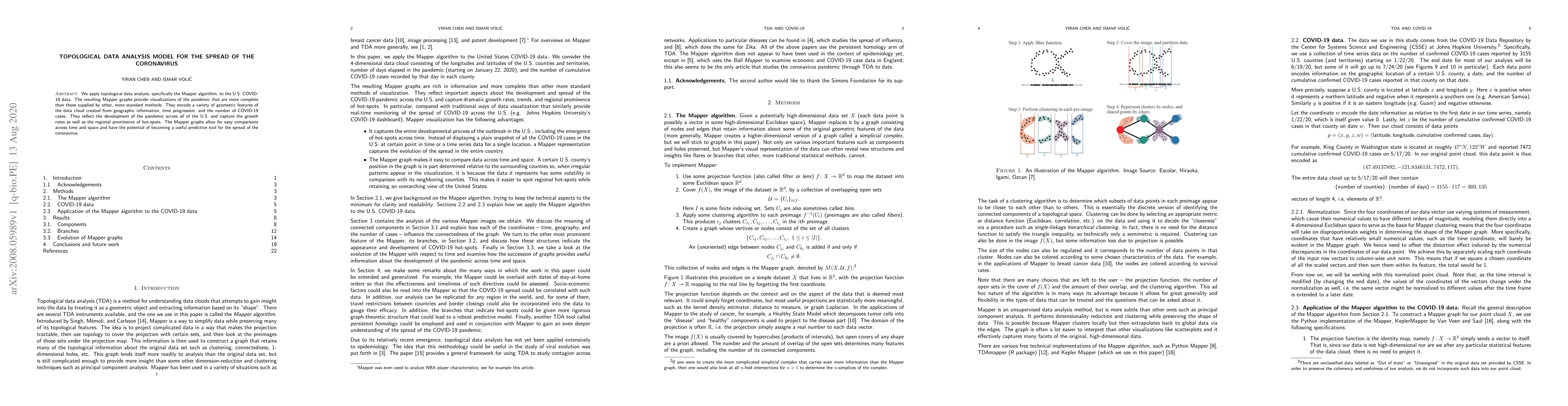 We apply topological data analysis, specifically the Mapper algorithm, to the U.S. COVID-19 data. The resulting Mapper graphs provide visualizations of the pandemic that are more complete than those supplied by other, more standard methods. They encode a variety of geometric features of the data cloud created from geographic information, time progression, and the number of COVID-19 cases. They reflect the development of the pandemic across all of the U.S. and capture the growth rates as well as the regional prominence of hot-spots. The Mapper graphs allow for easy comparisons across time and space and have the potential of becoming a useful predictive tool for the spread of the coronavirus.