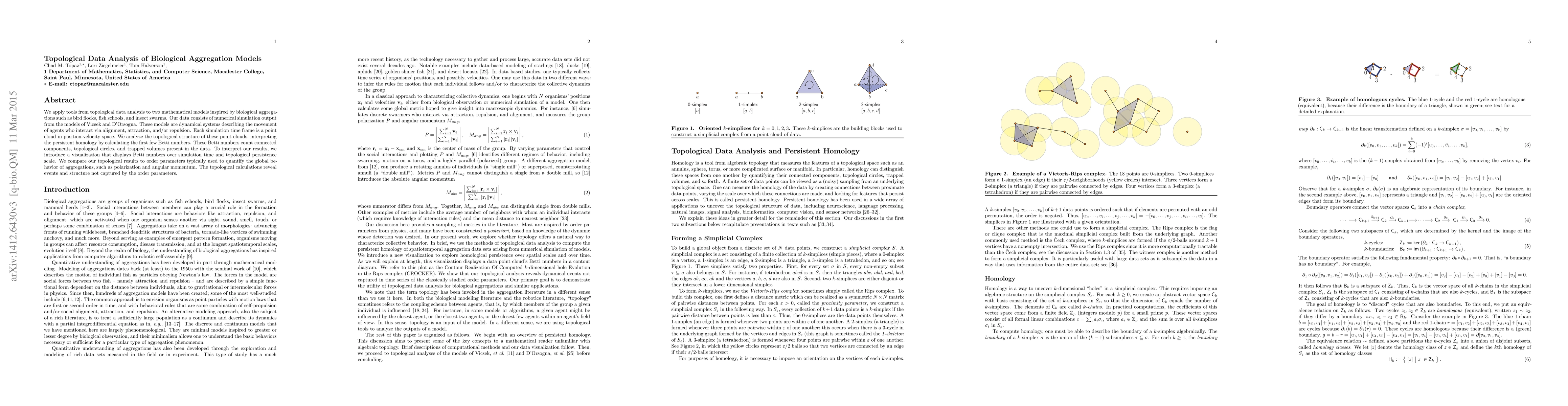 We apply tools from topological data analysis to two mathematical models inspired by biological aggregations such as bird flocks, fish schools, and insect swarms. Our data consists of numerical simulation output from the models of Vicsek and D'Orsogna. These models are dynamical systems describing the movement of agents who interact via alignment, attraction, and/or repulsion. Each simulation time frame is a point cloud in position-velocity space. We analyze the topological structure of these point clouds, interpreting the persistent homology by calculating the first few Betti numbers. These Betti numbers count connected components, topological circles, and trapped volumes present in the data. To interpret our results, we introduce a visualization that displays Betti numbers over simulation time and topological persistence scale. We compare our topological results to order parameters typically used to quantify the global behavior of aggregations, such as polarization and angular momentum. The topological calculations reveal events and structure not captured by the order parameters.
