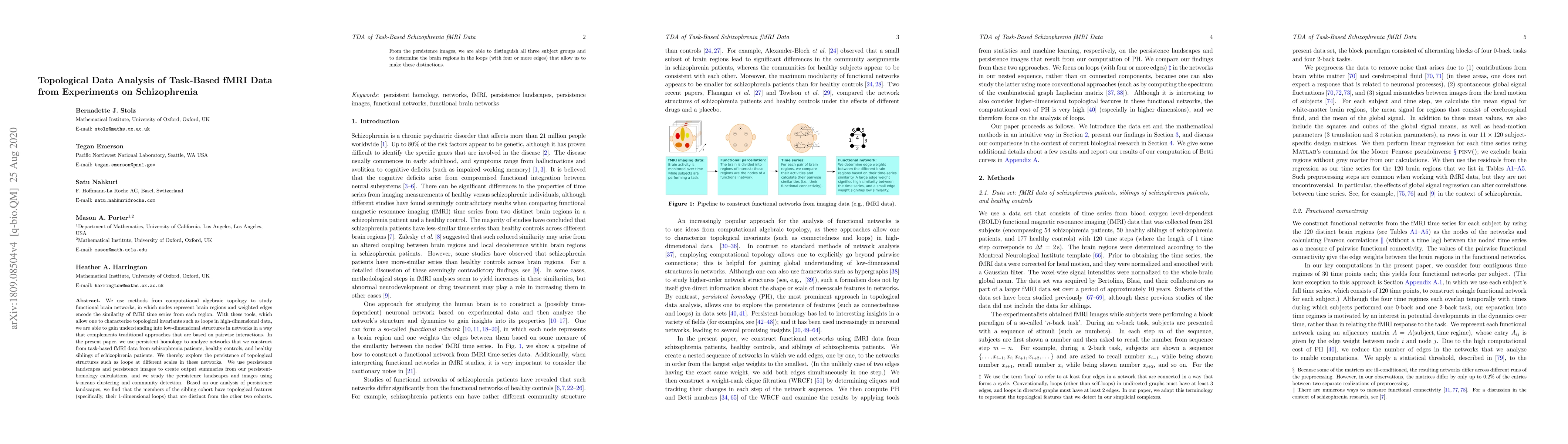 We use methods from computational algebraic topology to study functional brain networks, in which nodes represent brain regions and weighted edges encode the similarity of fMRI time series from each region. With these tools, which allow one to characterize topological invariants such as loops in high-dimensional data, we are able to gain understanding into low-dimensional structures in networks in a way that complements traditional approaches that are based on pairwise interactions. In the present paper, we use persistent homology to analyze networks that we construct from task-based fMRI data from schizophrenia patients, healthy controls, and healthy siblings of schizophrenia patients. We thereby explore the persistence of topological structures such as loops at different scales in these networks. We use persistence landscapes and persistence images to create output summaries from our persistent-homology calculations, and we study the persistence landscapes and images using $k$-means clustering and community detection. Based on our analysis of persistence landscapes, we find that the members of the sibling cohort have topological features (specifically, their 1-dimensional loops) that are distinct from the other two cohorts. From the persistence images, we are able to distinguish all three subject groups and to determine the brain regions in the loops (with four or more edges) that allow us to make these distinctions.