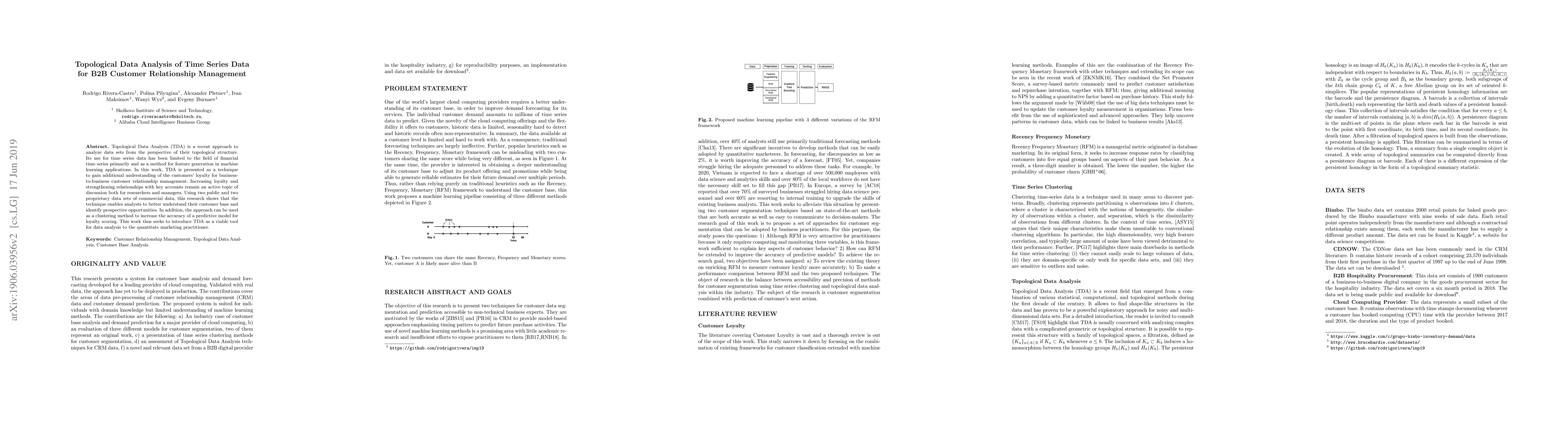 This research applies Topological Data Analysis (TDA) to time series data for B2B customer relationship management, demonstrating its potential to enhance understanding of customer loyalty and improve predictive models for loyalty scoring. The study uses both public and proprietary datasets to show TDA's effectiveness in identifying customer base insights and clustering opportunities.