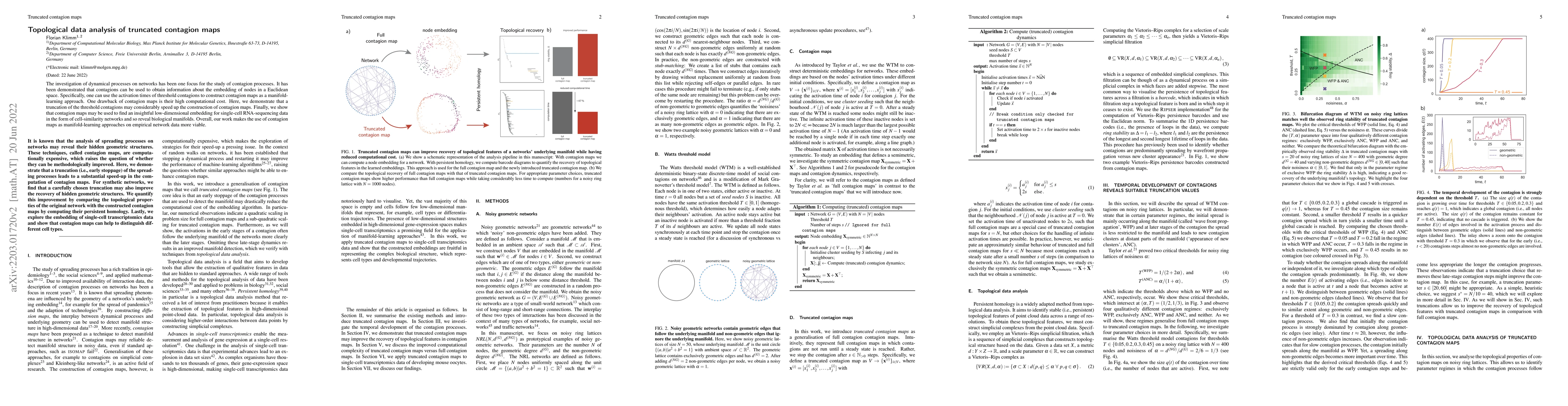 The investigation of dynamical processes on networks has been one focus for the study of contagion processes. It has been demonstrated that contagions can be used to obtain information about the embedding of nodes in a Euclidean space. Specifically, one can use the activation times of threshold contagions to construct contagion maps as a manifold-learning approach. One drawback of contagion maps is their high computational cost. Here, we demonstrate that a truncation of the threshold contagions may considerably speed up the construction of contagion maps. Finally, we show that contagion maps may be used to find an insightful low-dimensional embedding for single-cell RNA-sequencing data in the form of cell-similarity networks and so reveal biological manifolds. Overall, our work makes the use of contagion maps as manifold-learning approaches on empirical network data more viable.