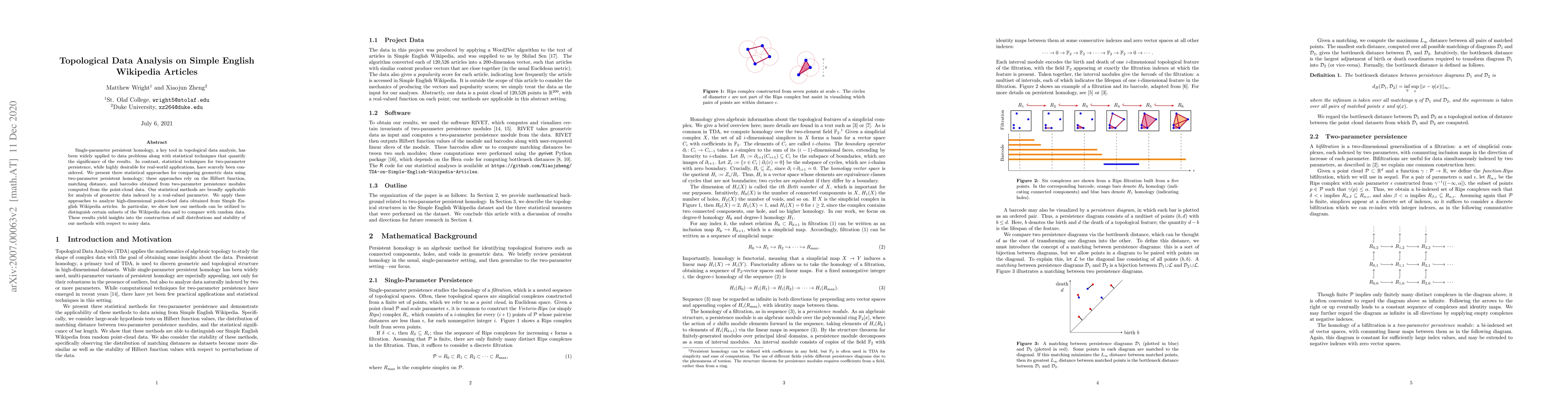 Researchers developed statistical methods to compare geometric data using two-parameter persistent homology, applying it to analyze point-cloud data from Wikipedia articles to distinguish subsets and compare with random data.