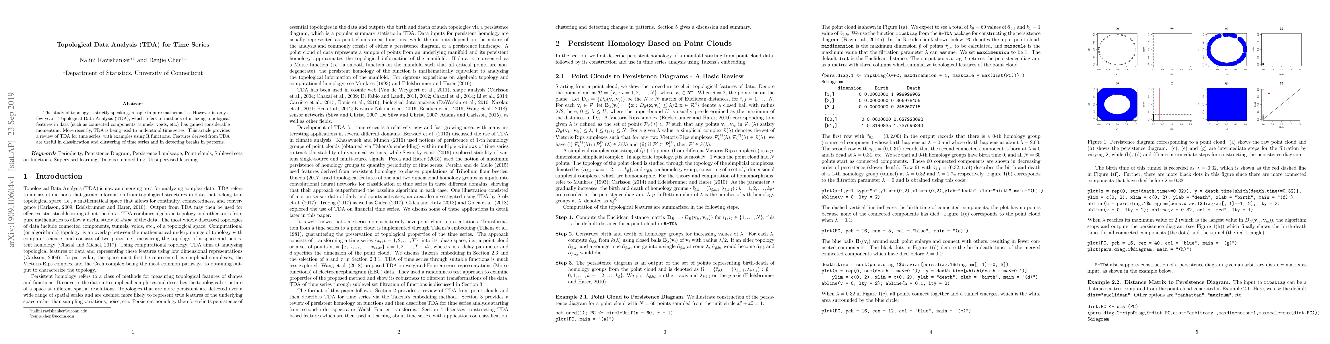 This paper reviews the application of Topological Data Analysis (TDA) to time series, highlighting its use in identifying topological features like connected components and voids. It demonstrates how TDA aids in time series classification, clustering, and pattern break detection using R functions.