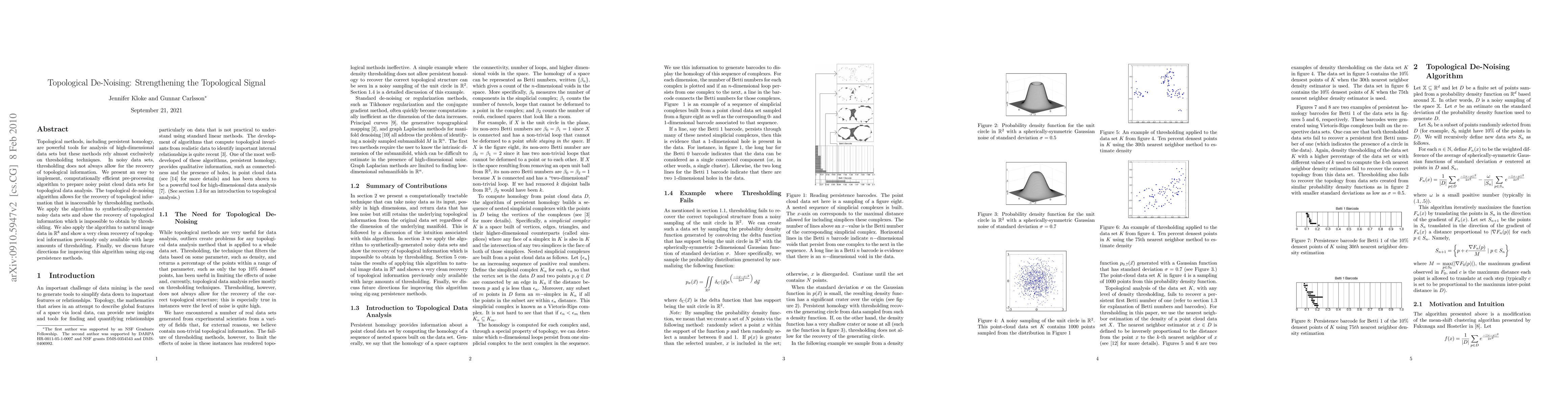 Topological methods, including persistent homology, are powerful tools for analysis of high-dimensional data sets but these methods rely almost exclusively on thresholding techniques. In noisy data sets, thresholding does not always allow for the recovery of topological information. We present an easy to implement, computationally efficient pre-processing algorithm to prepare noisy point cloud data sets for topological data analysis. The topological de-noising algorithm allows for the recovery of topological information that is inaccessible by thresholding methods. We apply the algorithm to synthetically-generated noisy data sets and show the recovery of topological information which is impossible to obtain by thresholding. We also apply the algorithm to natural image data in R^8 and show a very clean recovery of topological information previously only available with large amounts of thresholding. Finally, we discuss future directions for improving this algorithm using zig-zag persistence methods.