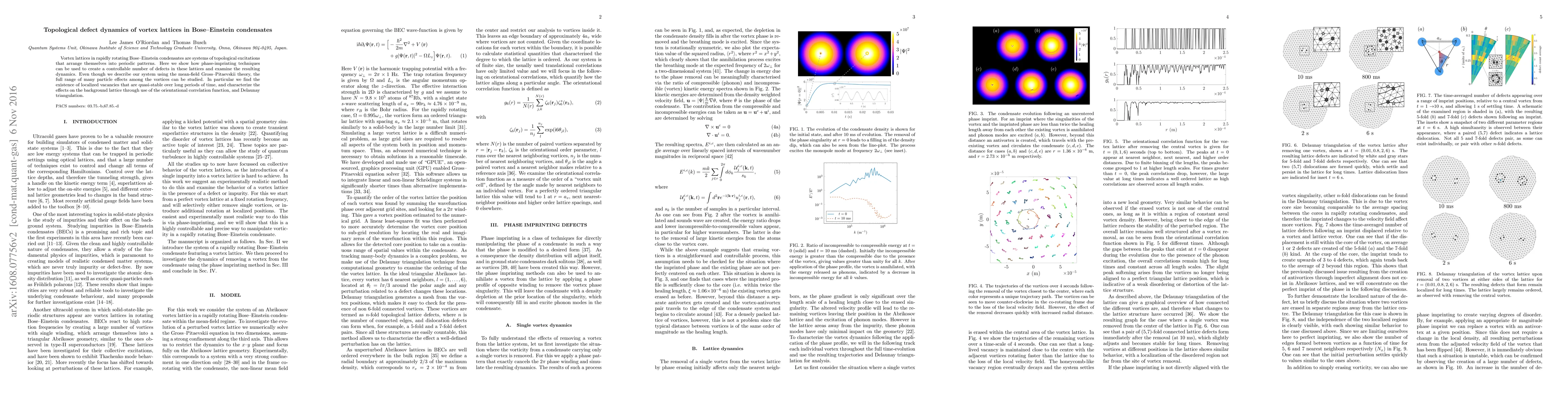 The paper introduces a method for controllable creation of topological defects in vortex lattices using phase imprinting and characterizes their dynamics through mean-field theory, orientational correlation functions, and Delaunay triangulation.