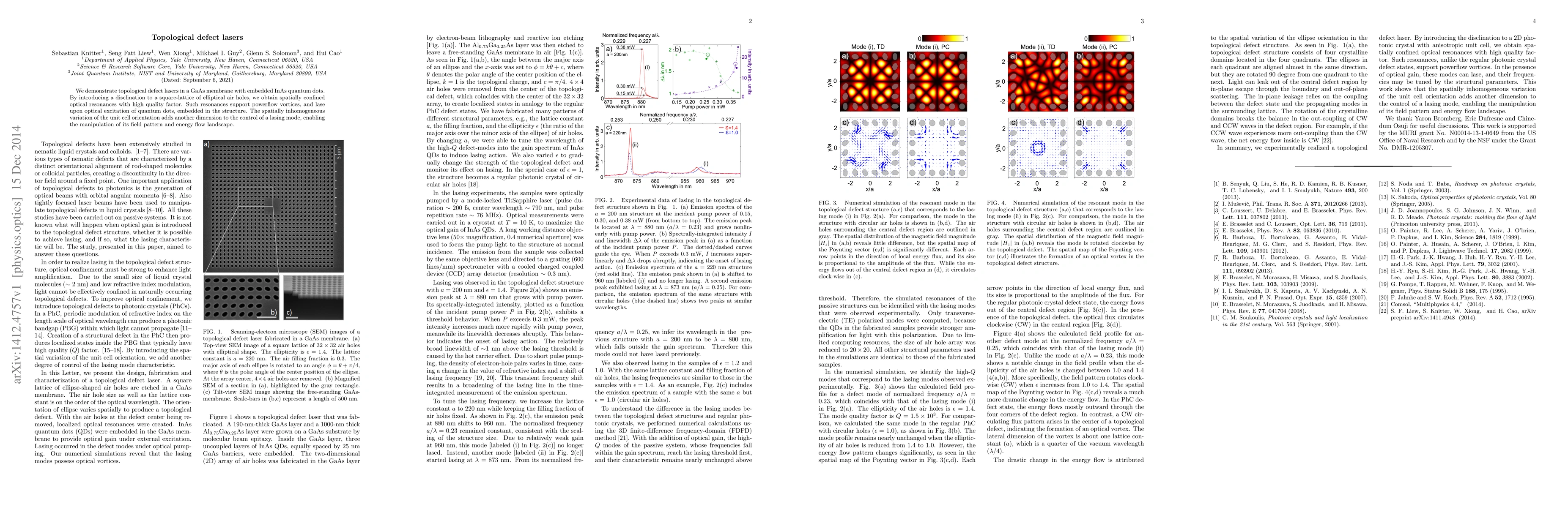 We demonstrate topological defect lasers in a GaAs membrane with embedded InAs quantum dots. By introducing a disclination to a square-lattice of elliptical air holes, we obtain spatially confined optical resonances with high quality factor. Such resonances support powerflow vortices, and lase upon optical excitation of quantum dots, embedded in the structure. The spatially inhomogeneous variation of the unit cell orientation adds another dimension to the control of a lasing mode, enabling the manipulation of its field pattern and energy flow landscape.