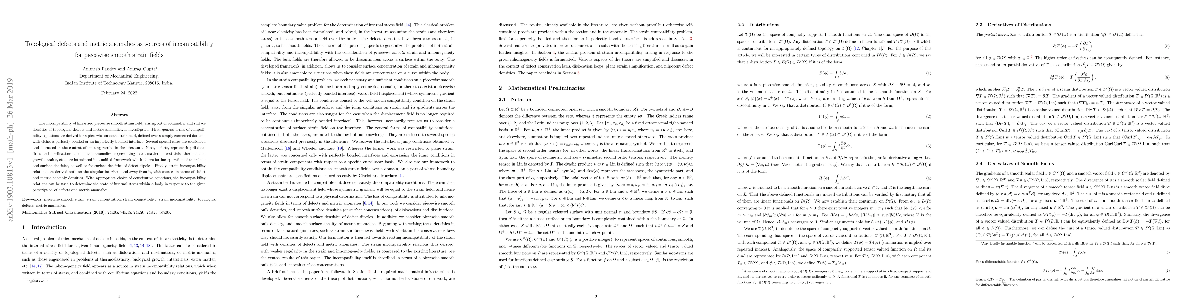 This paper investigates the incompatibility of piecewise smooth strain fields due to topological defects and metric anomalies, deriving compatibility equations and strain incompatibility relations that account for dislocations, disclinations, and various types of strains. The study provides a framework to determine internal stress states in response to the presence of these defects and anomalies.