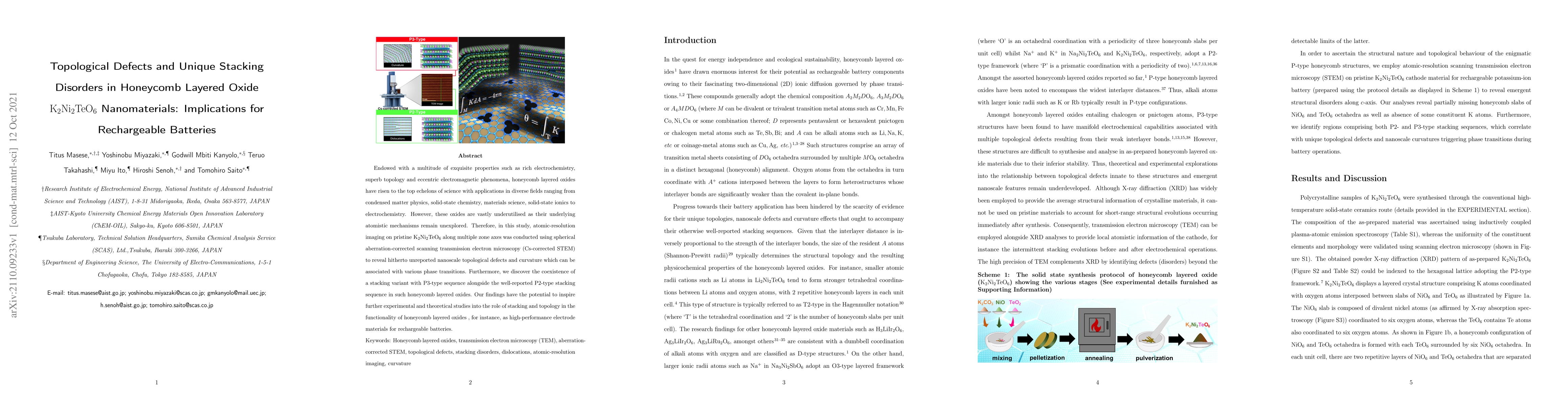 This study uses atomic-resolution imaging to uncover nanoscale topological defects and stacking disorders in $\rm K_2Ni_2TeO_6$ nanomaterials, revealing a coexistence of stacking variants that could enhance understanding of their electrochemical properties and potential use in rechargeable batteries.