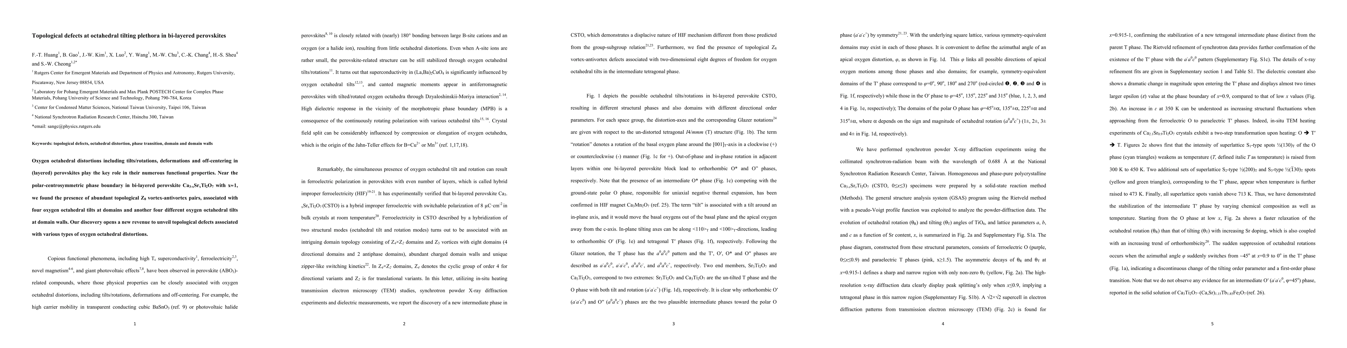 This paper investigates topological defects in bi-layered perovskite Ca3-xSrxTi2O7, revealing abundant Z8 vortex-antivortex pairs linked to oxygen octahedral tilts within domains and at domain boundaries. This discovery provides new insights into the relationship between topological defects and oxygen octahedral distortions in perovskites.