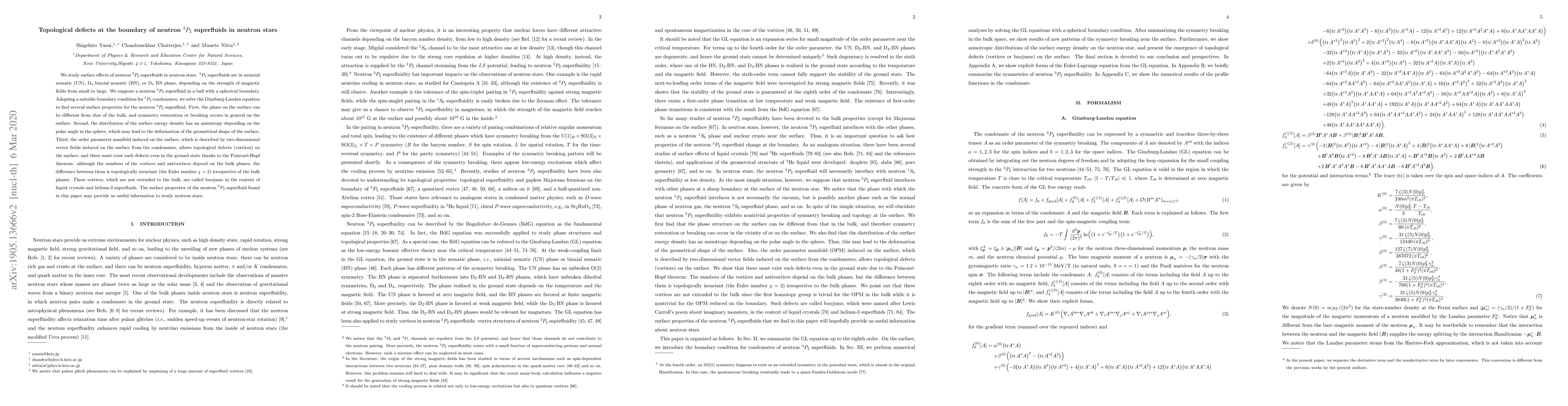 This paper investigates the topological defects and surface properties of neutron $^{3}P_{2}$ superfluids in neutron stars, finding that surface phase differences, anisotropic surface energy density, and topological defects (vortices or "boojums") exist due to boundary conditions and the Poincaré-Hopf theorem. These findings offer insights into neutron star physics.