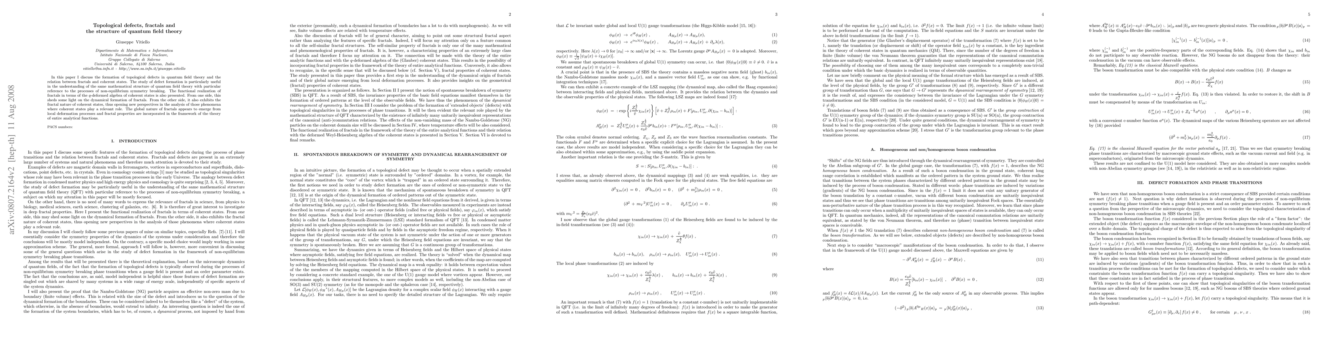 This paper explores how topological defects and fractals relate to quantum field theory, shedding light on non-equilibrium symmetry breaking and the dynamics of fractal formation. It also reveals the fractal nature of coherent states using a q-deformed algebra framework.
