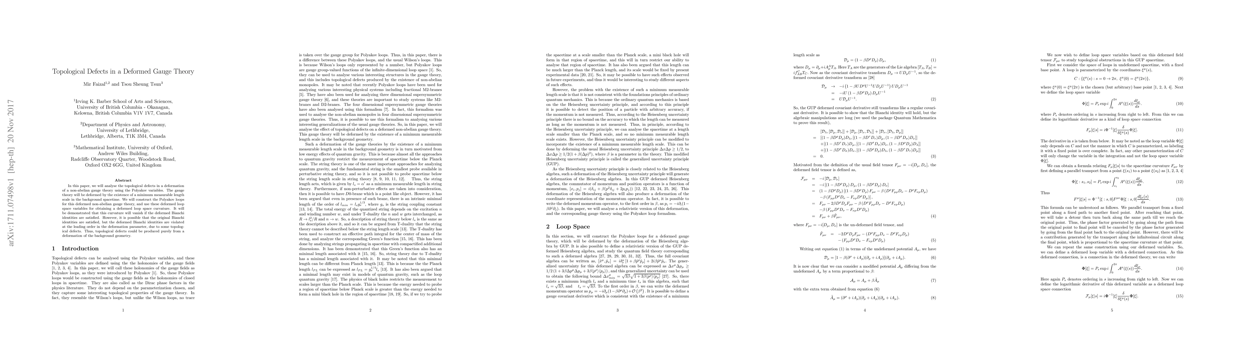 In this paper, we will analyse the topological defects in a deformation of a non-abelian gauge theory using the Polyakov variables. The gauge theory will be deformed by the existence of a minimum measurable length scale in the background spacetime. We will construct the Polyakov loops for this deformed non-abelian gauge theory, and use these deformed loop space variables for obtaining a deformed loop space curvature. It will be demonstrated that this curvature will vanish if the deformed Bianchi identities are satisfied. However, it is possible that the original Bianchi identities are satisfied, but the deformed Bianchi identities are violated at the leading order in the deformation parameter, due to some topological defects. Thus, topological defects could be produced purely from a deformation of the background geometry.