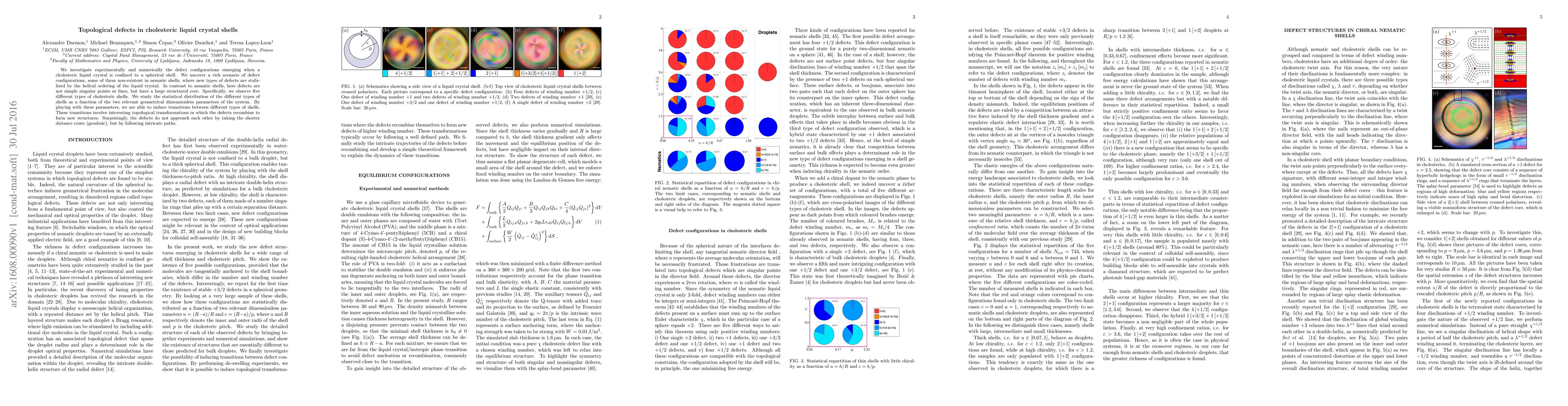 This paper explores experimentally and numerically the unique topological defect configurations in cholesteric liquid crystal shells, revealing complex defect structures not seen in nematic shells. The study identifies five distinct cholesteric shell types and their transitions, highlighting intricate defect recombination paths that deviate from the shortest geodesic route.