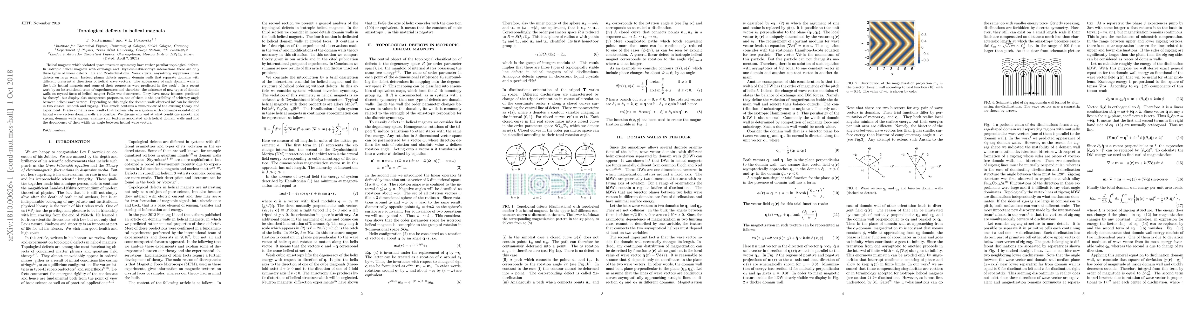 The paper reviews existing theory and presents new results on topological defects in helical magnets, combining theoretical analysis with experimental findings.