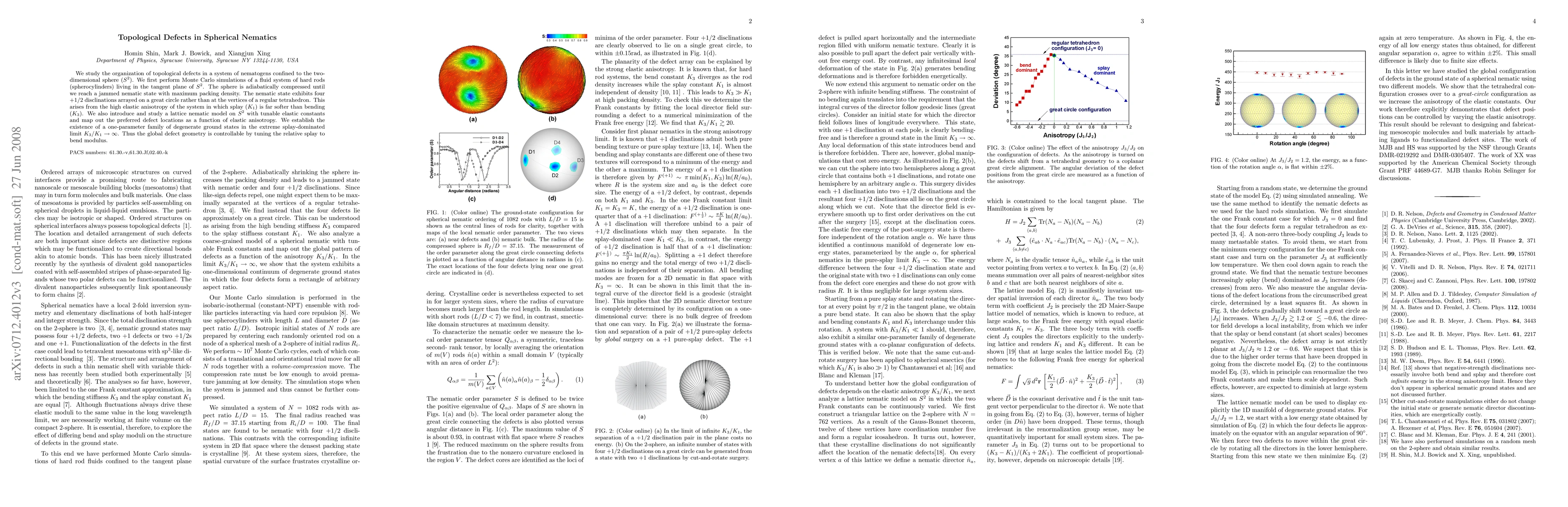 We study the organization of topological defects in a system of nematogens confined to the two-dimensional sphere (S^2). We first perform Monte Carlo simulations of a fluid system of hard rods (spherocylinders) living in the tangent plane of S^2. The sphere is adiabatically compressed until we reach a jammed nematic state with maximum packing density. The nematic state exhibits four +1/2 disclinations arrayed on a great circle rather than at the vertices of a regular tetrahedron. This arises from the high elastic anisotropy of the system in which splay (K_1) is far softer than bending (K_3). We also introduce and study a lattice nematic model on S^2 with tunable elastic constants and map out the preferred defect locations as a function of elastic anisotropy. We establish the existence of a one-parameter family of degenerate ground states in the extreme splay-dominated limit K_1/K_3 -> 0. Thus the global defect geometry is controllable by tuning the relative splay to bend modulus.