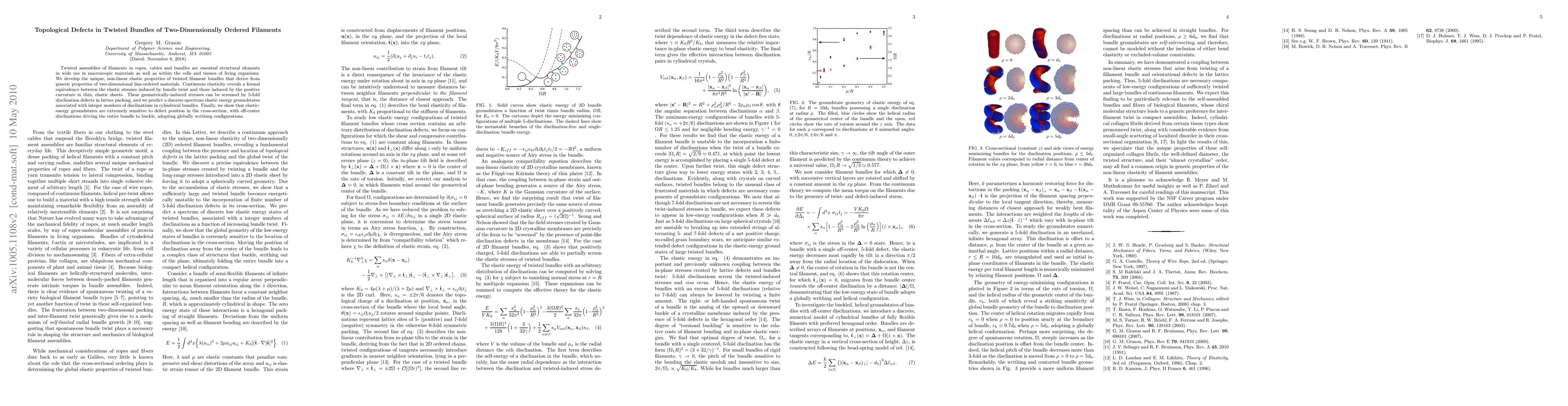 This paper investigates the topological defects in twisted bundles of two-dimensionally ordered filaments, revealing their unique non-linear elastic properties. The study predicts a discrete spectrum of elastic energy groundstates linked to the number of disclination defects, which are highly sensitive to defect positioning, causing the bundle to buckle when off-center.