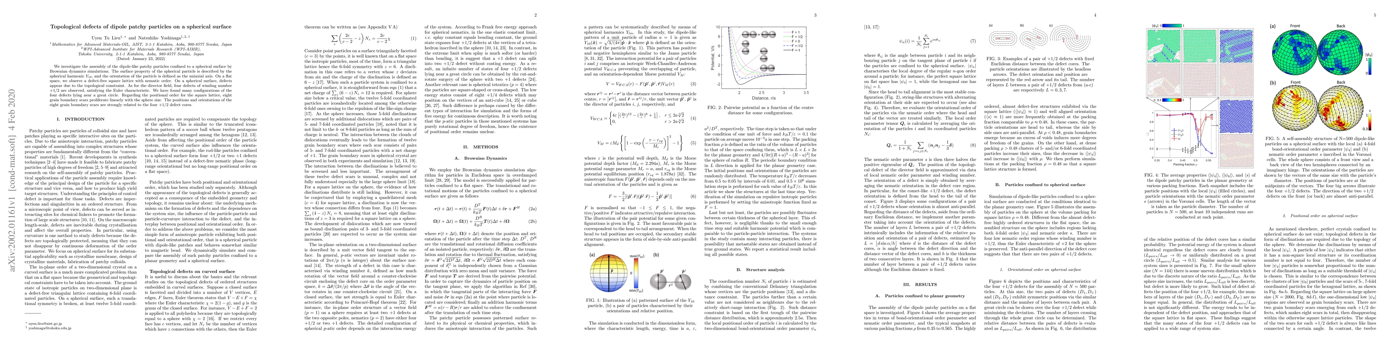 This paper examines the assembly of dipole-like patchy particles on a spherical surface, revealing topological defects due to the spherical constraint. It identifies four defects of winding number $+1/2$ and eight grain boundary scars, with the latter correlating to the defect cores.
