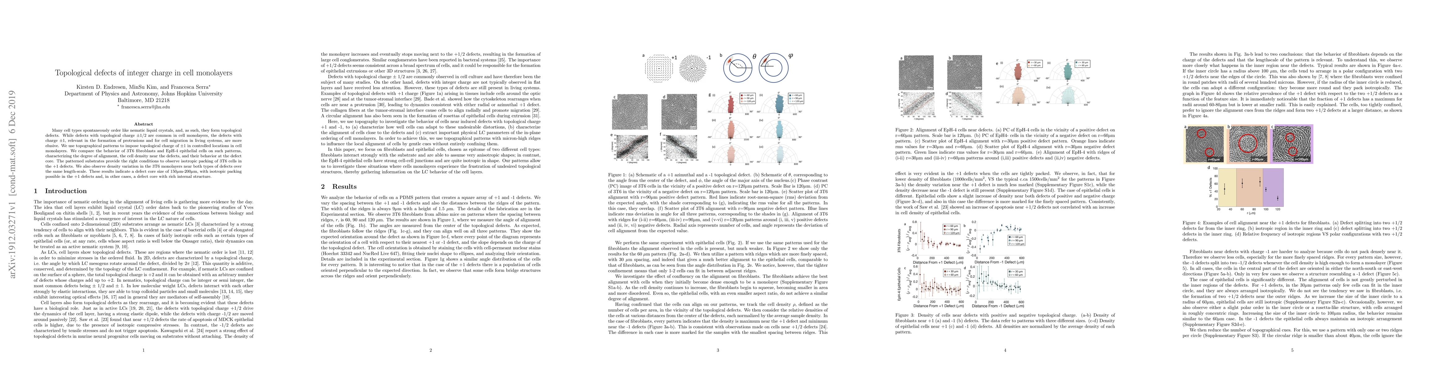 This study investigates topological defects of integer charge in cell monolayers, focusing on $\pm$1 defects that influence cell migration and protrusion formation. By using topographical patterns, the researchers observe the behavior of 3T6 fibroblasts and EpH-4 epithelial cells, noting isotropic packing and density variations in 3T6 cells, indicating a defect core size of 150-200 $\mu$m.