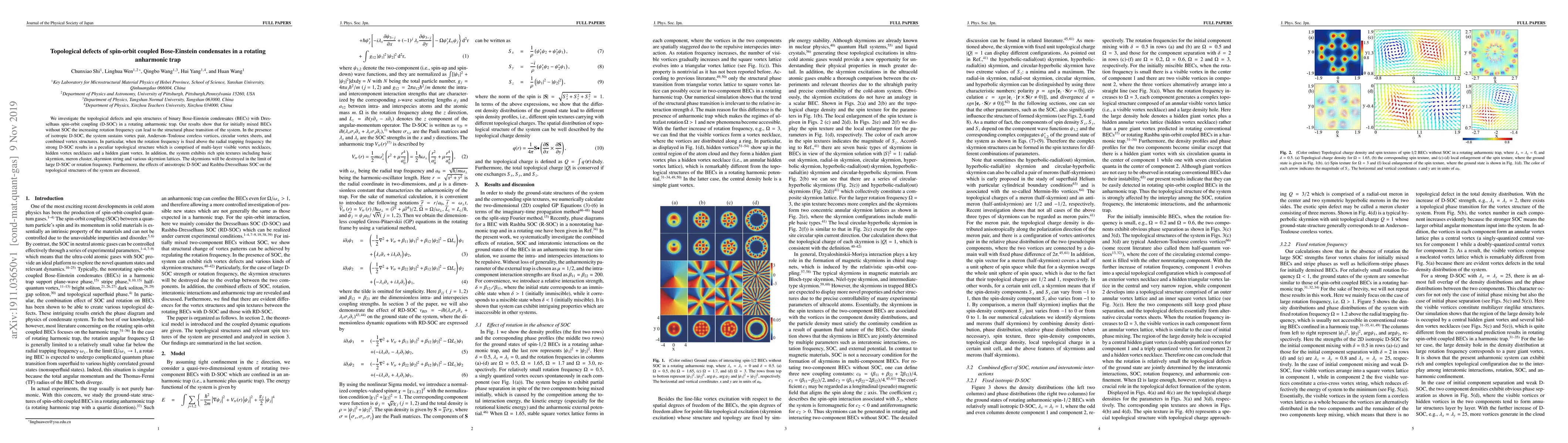 This paper explores topological defects and spin structures in spin-orbit coupled Bose-Einstein condensates in a rotating anharmonic trap, revealing complex vortex and spin textures, including vortex necklaces and skyrmions, which are influenced by spin-orbit coupling and rotation frequency. The study also examines the effects of different spin-orbit coupling types on these structures.