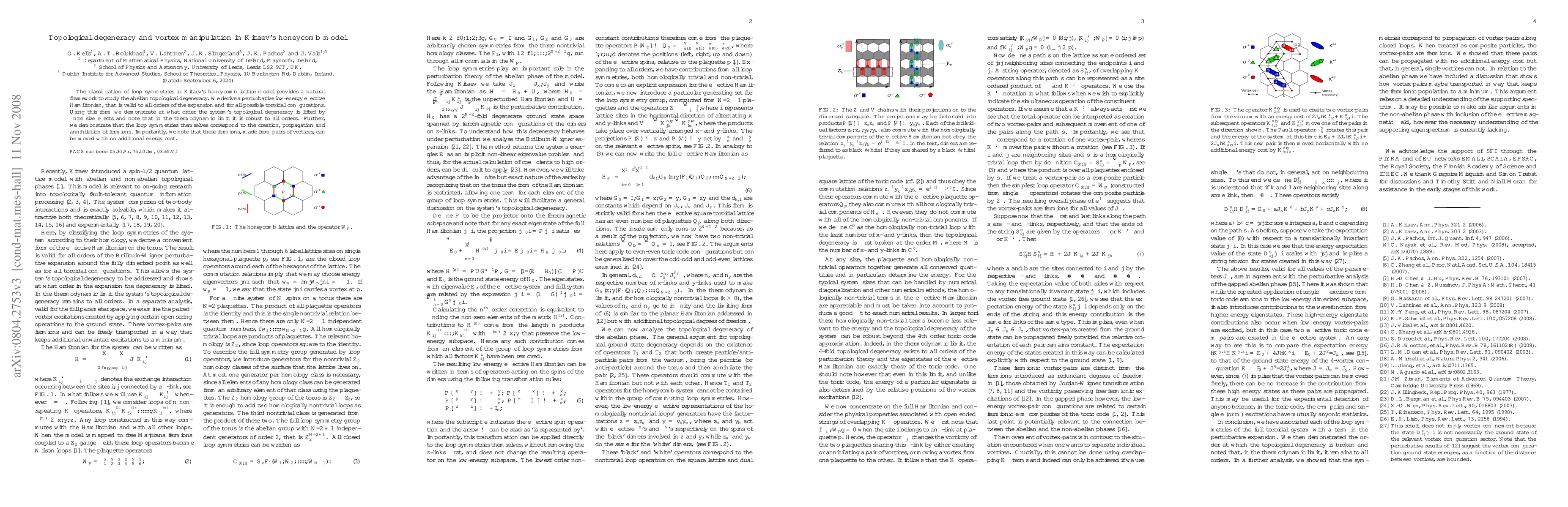 The classification of loop symmetries in Kitaev's honeycomb lattice model provides a natural framework to study the abelian topological degeneracy. We derive a perturbative low-energy effective Hamiltonian, that is valid to all orders of the expansion and for all possible toroidal configurations. Using this form we demonstrate at what order the system's topological degeneracy is lifted by finite size effects and note that in the thermodynamic limit it is robust to all orders. Further, we demonstrate that the loop symmetries themselves correspond to the creation, propagation and annihilation of fermions. Importantly, we note that these fermions, made from pairs of vortices, can be moved with no additional energy cost.