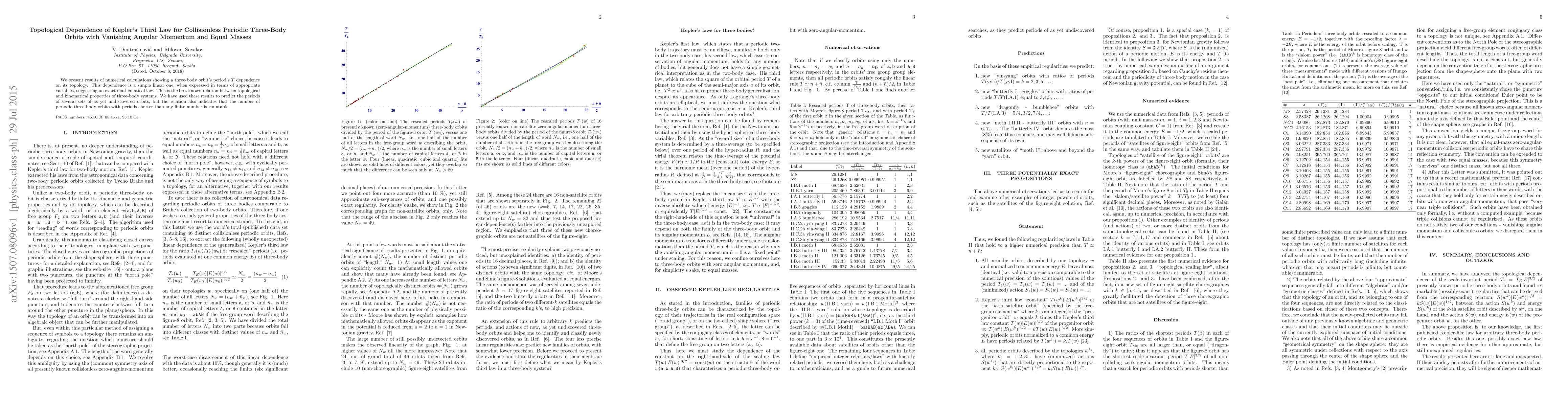 We present results of numerical calculations showing a three-body orbit's period's $T$ dependence on its topology. This dependence is a simple linear one, when expressed in terms of appropriate variables, suggesting an exact mathematical law. This is the first known relation between topological and kinematical properties of three-body systems. We have used these results to predict the periods of several sets of as yet undiscovered orbits, but the relation also indicates that the number of periodic three-body orbits with periods shorter than any finite number is countable.