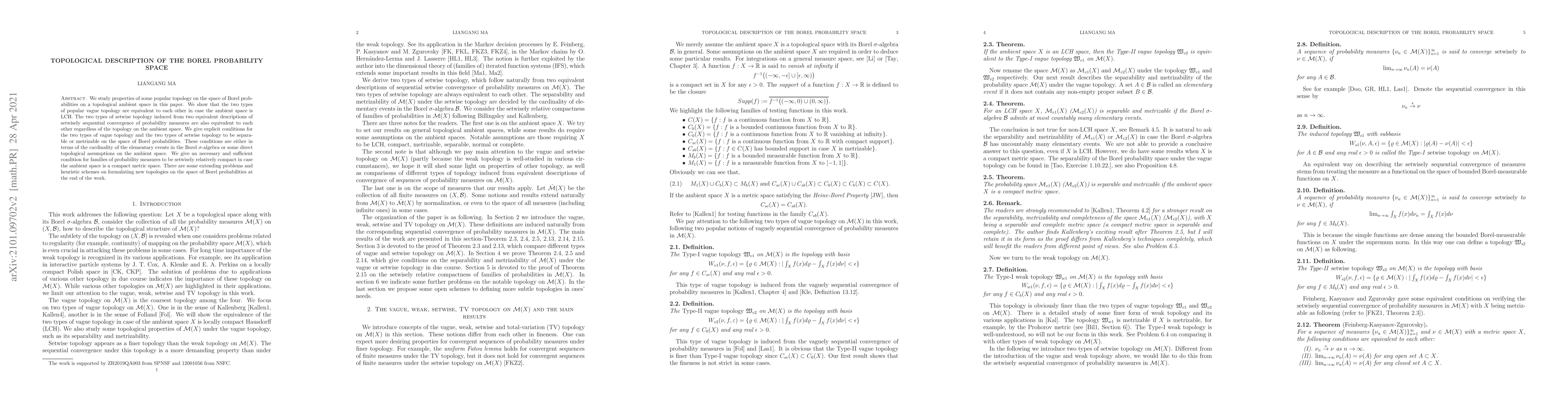 We study properties of some popular topology on the space of Borel probabilities on a topological ambient space in this paper. We show that the two types of popular vague topology are equivalent to each other in case the ambient space is LCH. The two types of setwise topology induced from two equivalent descriptions of setwisely sequential convergence of probability measures are also equivalent to each other regardless of the topology on the ambient space. We give explicit conditions for the two types of vague topology and the two types of setwise topology to be separable or metrizable on the space of Borel probabilities. These conditions are either in terms of the cardinality of the elementary events in the Borel $\sigma$-algebra or some direct topological assumptions on the ambient space. We give an necessary and sufficient condition for families of probability measures to be setwisely relatively compact in case the ambient space is a compact metric space. There are some extending problems and heuristic schemes on formulating new topologies on the space of Borel probabilities at the end of the work.