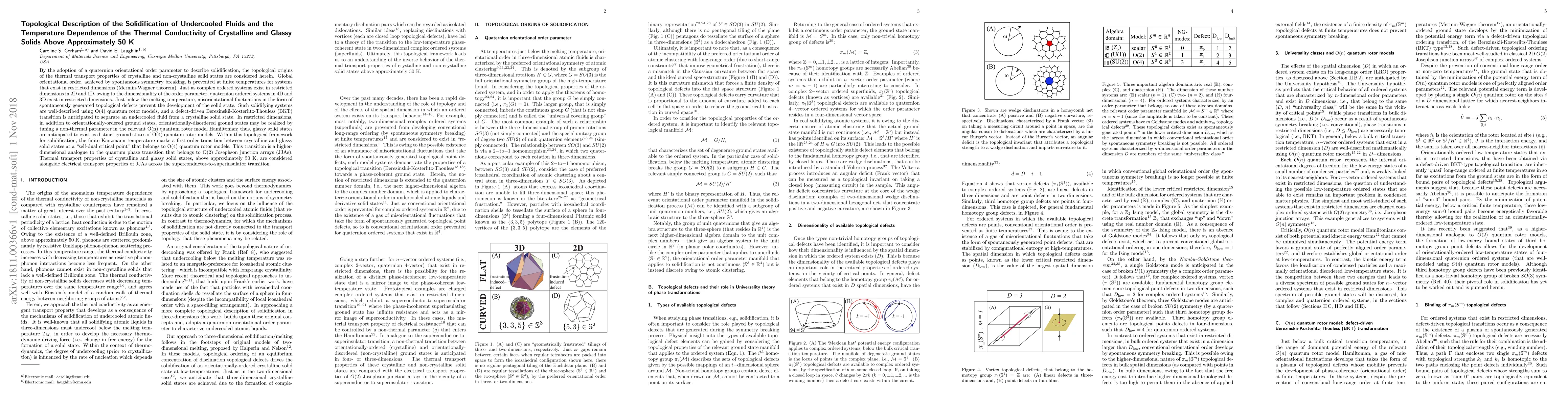 By the adoption of a quaternion orientational order parameter to describe solidification, the topological origins of the thermal transport properties of crystalline and non-crystalline solid states are considered herein. Global orientational order, achieved by spontaneous symmetry breaking, is prevented at finite temperatures for systems that exist in restricted dimensions (Mermin-Wagner theorem). Just as complex ordered systems exist in restricted dimensions in 2D and 1D, owing to the dimensionality of the order parameter, quaternion ordered systems in 4D and 3D exist in restricted dimensions. Just below the melting temperature, misorientational fluctuations in the form of spontaneously generated topological defects prevent the development of the solid state. Such solidifying systems are well-described using O(4) quantum rotor models, and a defect-driven Berezinskii-Kosterlitz-Thouless (BKT) transition is anticipated to separate an undercooled fluid from a crystalline solid state. In restricted dimensions, in addition to orientationally-ordered ground states, orientationally-disordered ground states may be realized by tuning a non-thermal parameter in the relevant O(n) quantum rotor model Hamiltonian; thus, glassy solid states are anticipated to exist as distinct ground states of O(4) quantum rotor models. Within this topological framework for solidification, the finite Kauzmann temperature marks a first-order transition between crystalline and glassy solid states at a "self-dual critical point" that belongs to O(4) quantum rotor models. This transition is a higher-dimensional analogue to the quantum phase transition that belongs to O(2) Josephson junction arrays (JJAs). Thermal transport properties of crystalline and glassy solid states, above approximately 50 K, are considered alongside electrical transport properties of JJAs across the superconductor-to-superinsulator transition.
