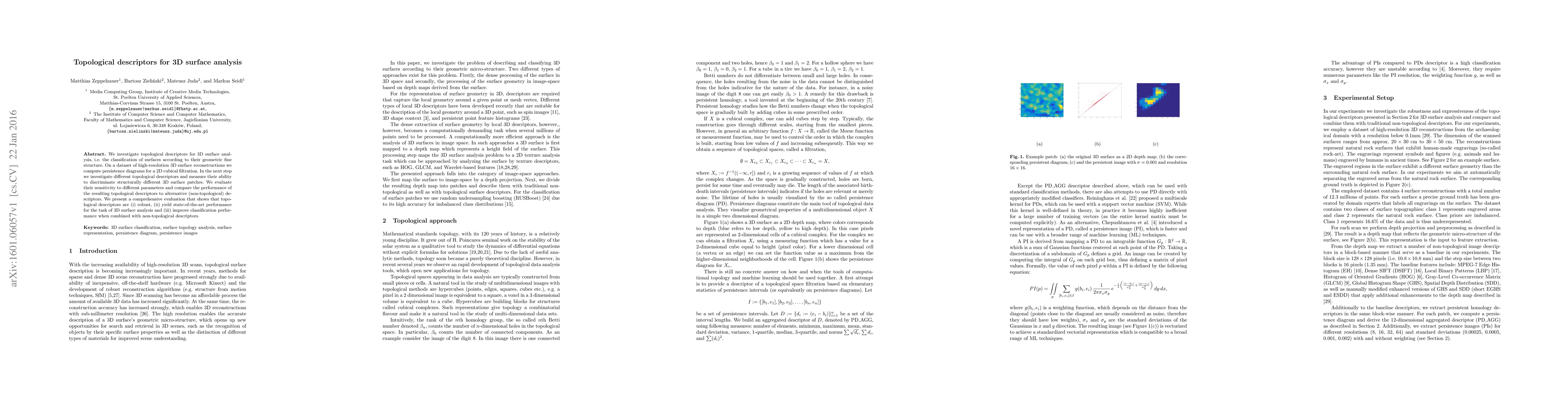 We investigate topological descriptors for 3D surface analysis, i.e. the classification of surfaces according to their geometric fine structure. On a dataset of high-resolution 3D surface reconstructions we compute persistence diagrams for a 2D cubical filtration. In the next step we investigate different topological descriptors and measure their ability to discriminate structurally different 3D surface patches. We evaluate their sensitivity to different parameters and compare the performance of the resulting topological descriptors to alternative (non-topological) descriptors. We present a comprehensive evaluation that shows that topological descriptors are (i) robust, (ii) yield state-of-the-art performance for the task of 3D surface analysis and (iii) improve classification performance when combined with non-topological descriptors.