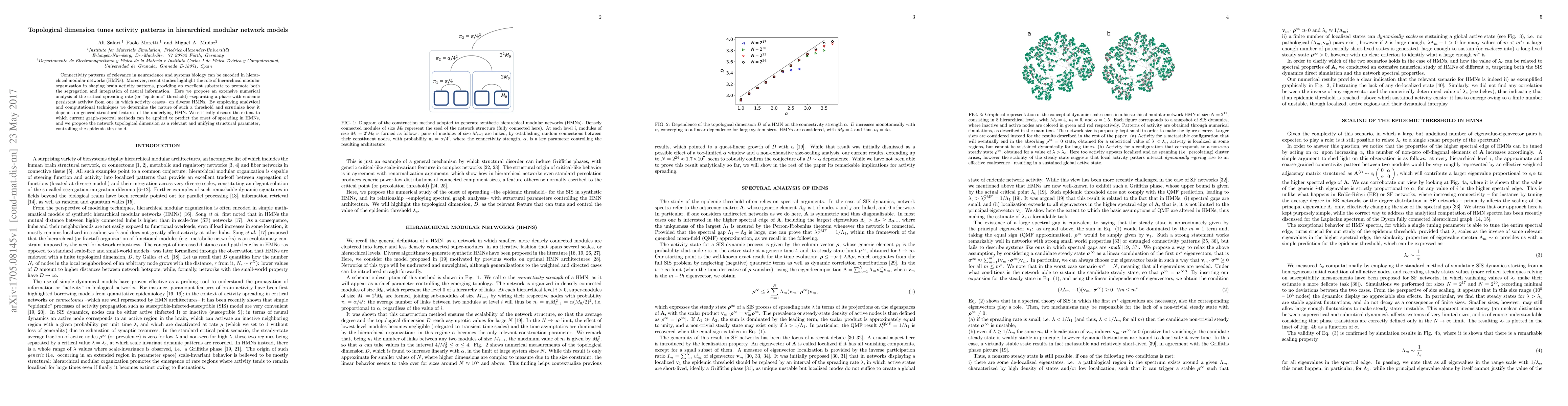 Connectivity patterns of relevance in neuroscience and systems biology can be encoded in hierarchical modular networks (HMNs). Moreover, recent studies highlight the role of hierarchical modular organization in shaping brain activity patterns, providing an excellent substrate to promote both the segregation and integration of neural information. Here we propose an extensive numerical analysis of the critical spreading rate (or "epidemic" threshold) --separating a phase with endemic persistent activity from one in which activity ceases-- on diverse HMNs. By employing analytical and computational techniques we determine the nature of such a threshold and scrutinize how it depends on general structural features of the underlying HMN. We critically discuss the extent to which current graph-spectral methods can be applied to predict the onset of spreading in HMNs, and we propose the network topological dimension as a relevant and unifying structural parameter, controlling the epidemic threshold.