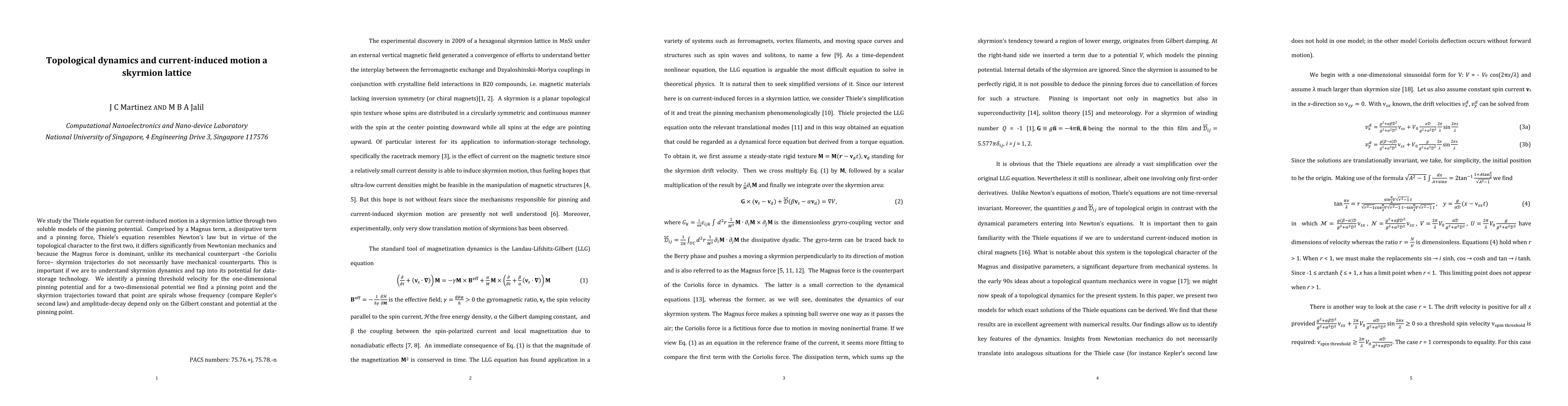 This paper investigates the Thiele equation governing current-induced motion in skyrmion lattices, revealing unique topological dynamics distinct from Newtonian mechanics due to the dominant Magnus force. The study identifies pinning thresholds and spiral trajectories in skyrmion motion, crucial for advancing skyrmion-based data-storage technologies.