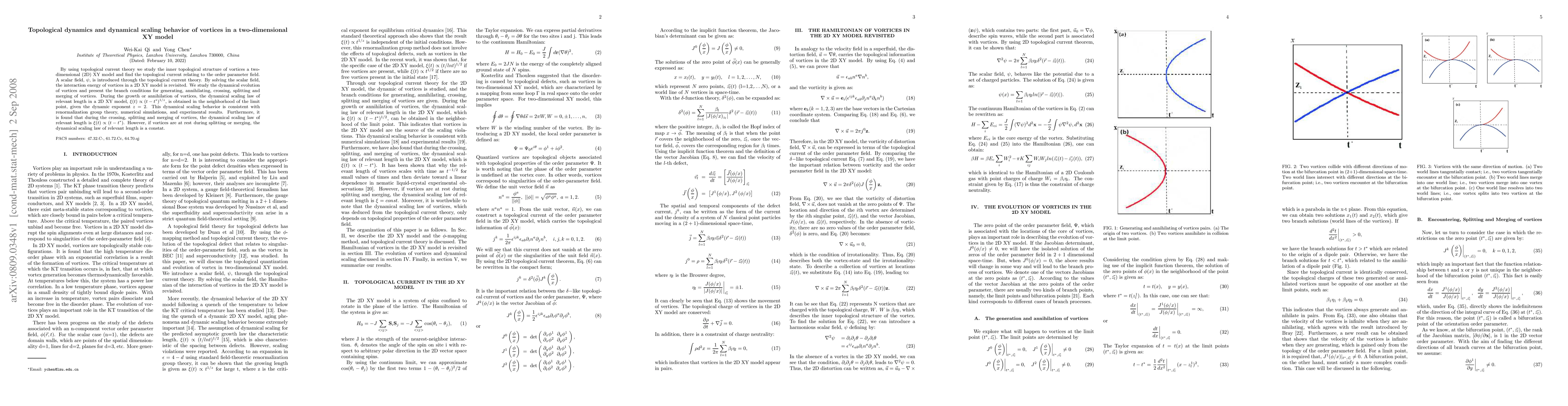 This paper investigates the topological dynamics of vortices in a 2D XY model using topological current theory, revealing the interaction energy and dynamical evolution of vortices. It finds a dynamical scaling law $\xi(t)\propto(t-t^*)^{1/z}$ with $z=2$ during vortex growth or annihilation, consistent with renormalization group theory and experimental results.