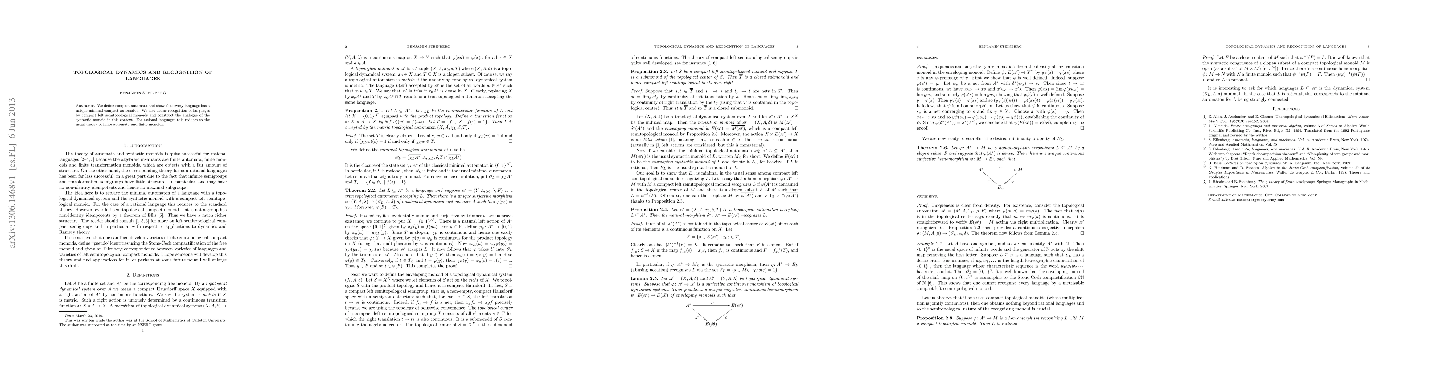 We define compact automata and show that every language has a unique minimal compact automaton. We also define recognition of languages by compact left semitopological monoids and construct the analogue of the syntactic monoid in this context. For rational languages this reduces to the usual theory of finite automata and finite monoids.