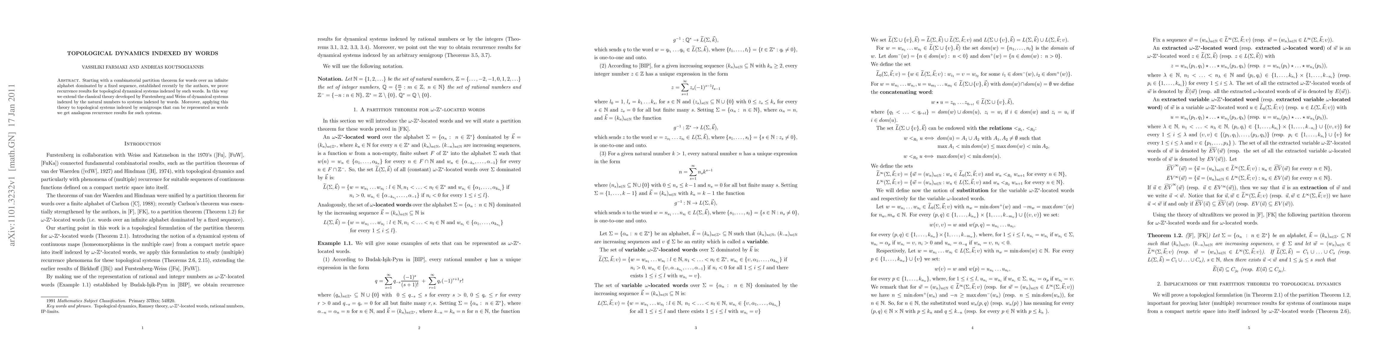 This paper extends classical recurrence theory from dynamical systems indexed by natural numbers to those indexed by words, leveraging a recent combinatorial partition theorem. It also applies this extended theory to topological systems indexed by semigroups represented as words, yielding analogous recurrence results.