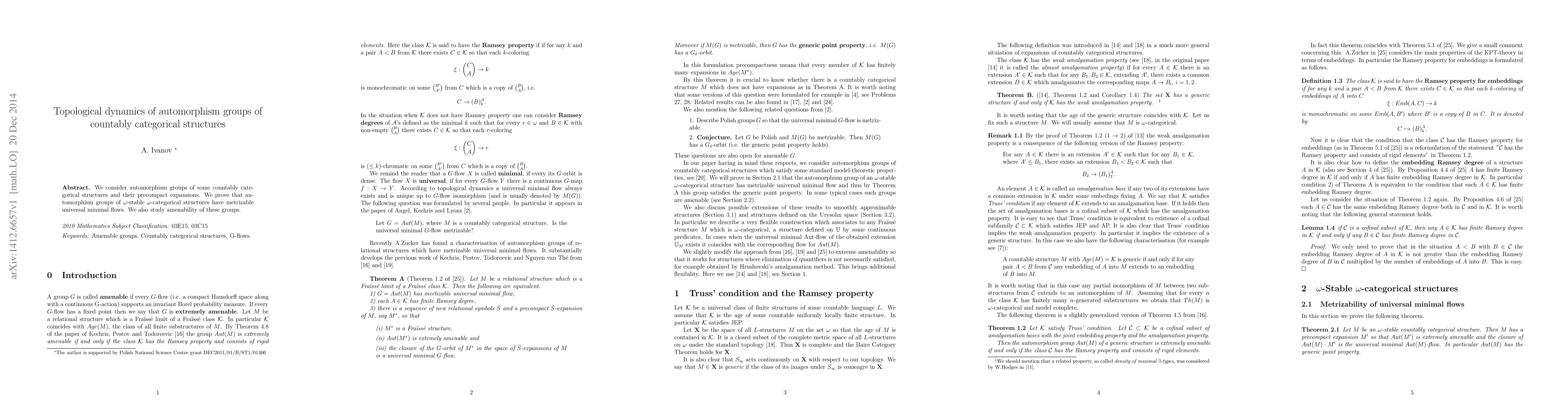 The paper analyzes automorphism groups of countably categorical structures, focusing on omega-stable omega-categorical structures, and proves that their universal minimal flows are metrizable. It also examines the amenability of these groups.